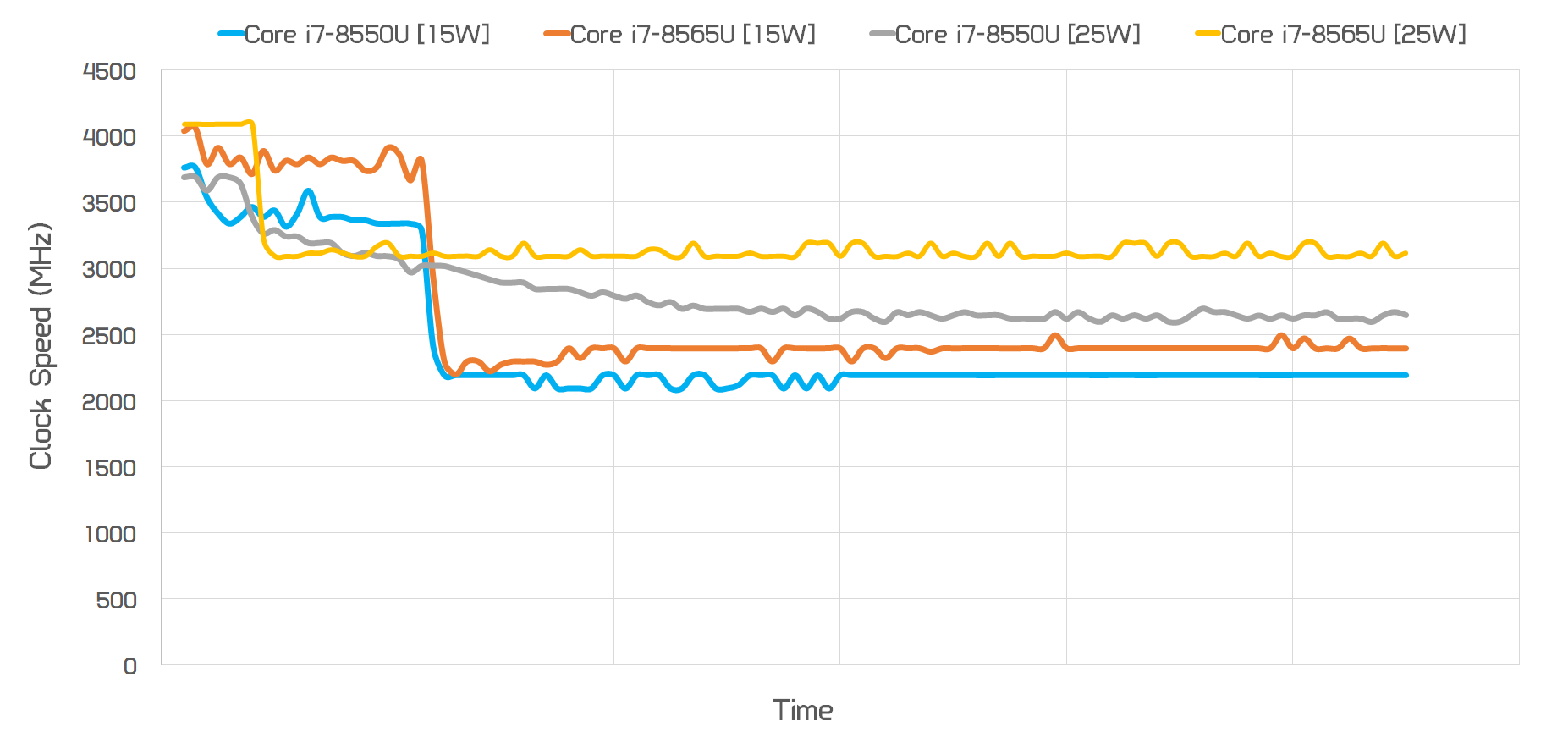 Pour expliquer ce qui se passe ici, il est utile de comparer la vitesse de l’horloge lors de l’exercice Cinebench. Les deux configurations, 15W et 25W, démarrent à la vitesse maximale de l’horloge Turbo, soit 3,7 GHz pour le 8550U et 4,1 GHz pour le 8565U. Cependant, lorsque la CPU revient à son état PL1 et qu’elle ne booste plus, le comportement est très différent.