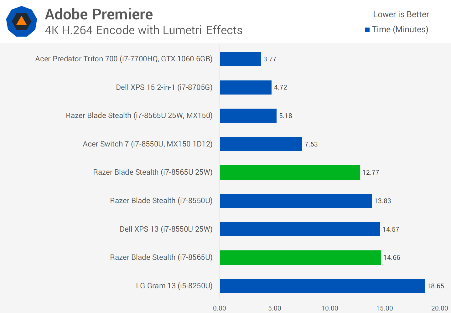 Adobe Premiere profite fortement de l'accélération du processeur graphique et l'iGPU de ces processeurs de 15 W est plutôt faible. Vous pouvez constater que les trois premiers processeurs associés à des graphiques de classe discrète enflamment la concurrence ici. Nous voyons également le 15W 8565U se placer légèrement derrière le 8550U, un résultat étrange et le seul repère où cela a été le cas. Cela dit, la configuration de 25W est maintenant 14% plus rapide.