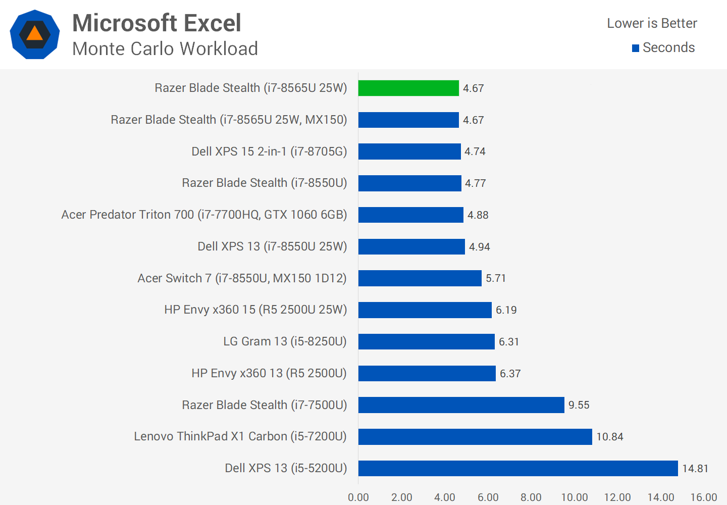 Microsoft Excel est une charge de travail qui s'exécute entièrement dans l'état d'amplification PL2. Par conséquent, il n'y a pas de différence de performances entre les configurations 25W et 15W. La i7-8565U détient un léger avantage sur la 8550U, et les deux reposent autour de la même marque que la 7700HQ, une autre performance impressionnante.