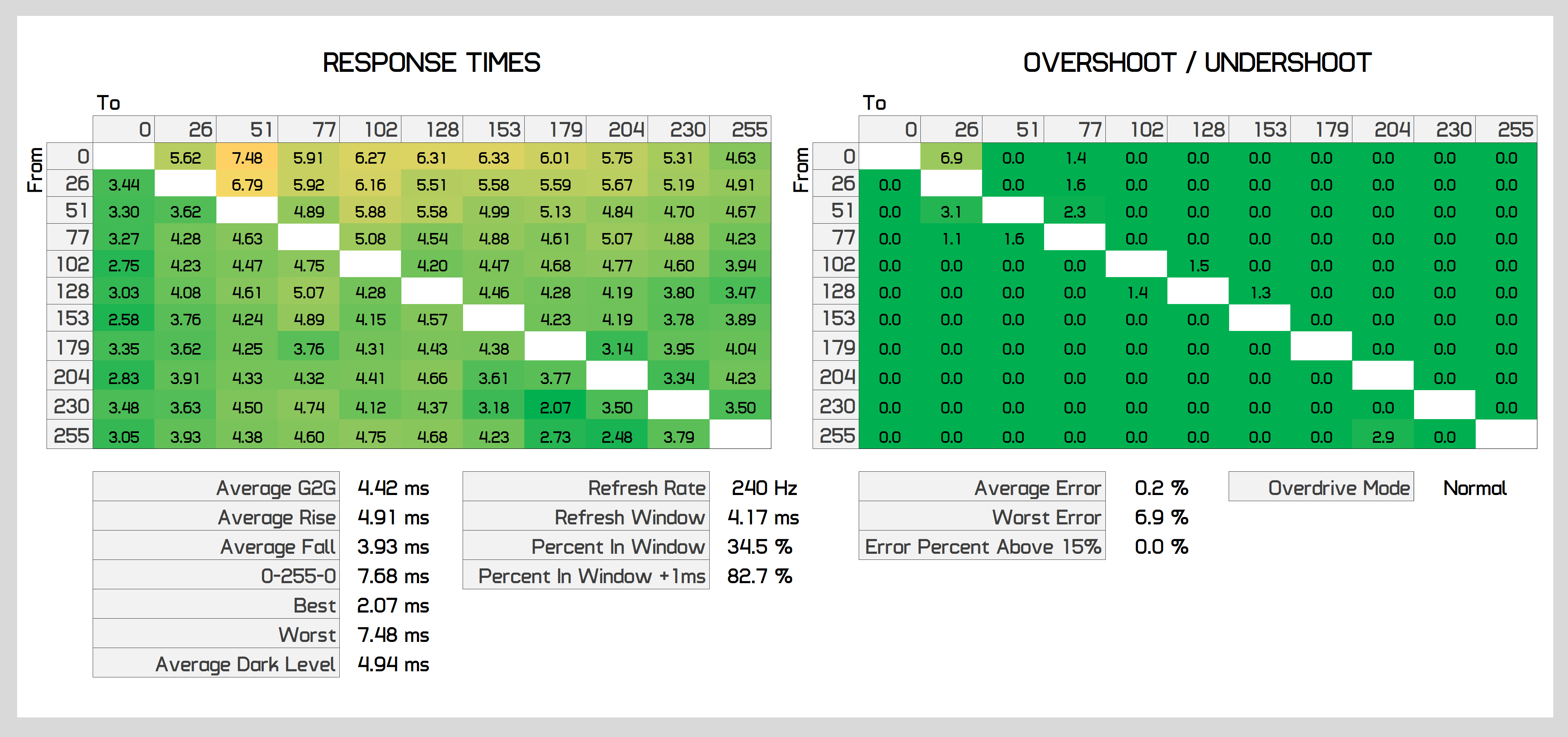 Cependant, le mode Normal fonctionne vraiment bien sur toute la plage de rafraîchissement. Même à 240 Hz, nous obtenons toujours une moyenne de 4,4 ms de gris à gris, ce qui est à peine 17% plus lent que le mode rapide. Mais avec le mode Normal, le dépassement ne devient perceptible qu'à 85 Hz, pas à 144 Hz, et même à 60 Hz, les images fantômes inverses ne sont pas vraiment un problème. Pendant ce temps, les temps de réponse se situent entre 4,0 et 4,5 ms, ce qui est idéal pour un écran IPS.