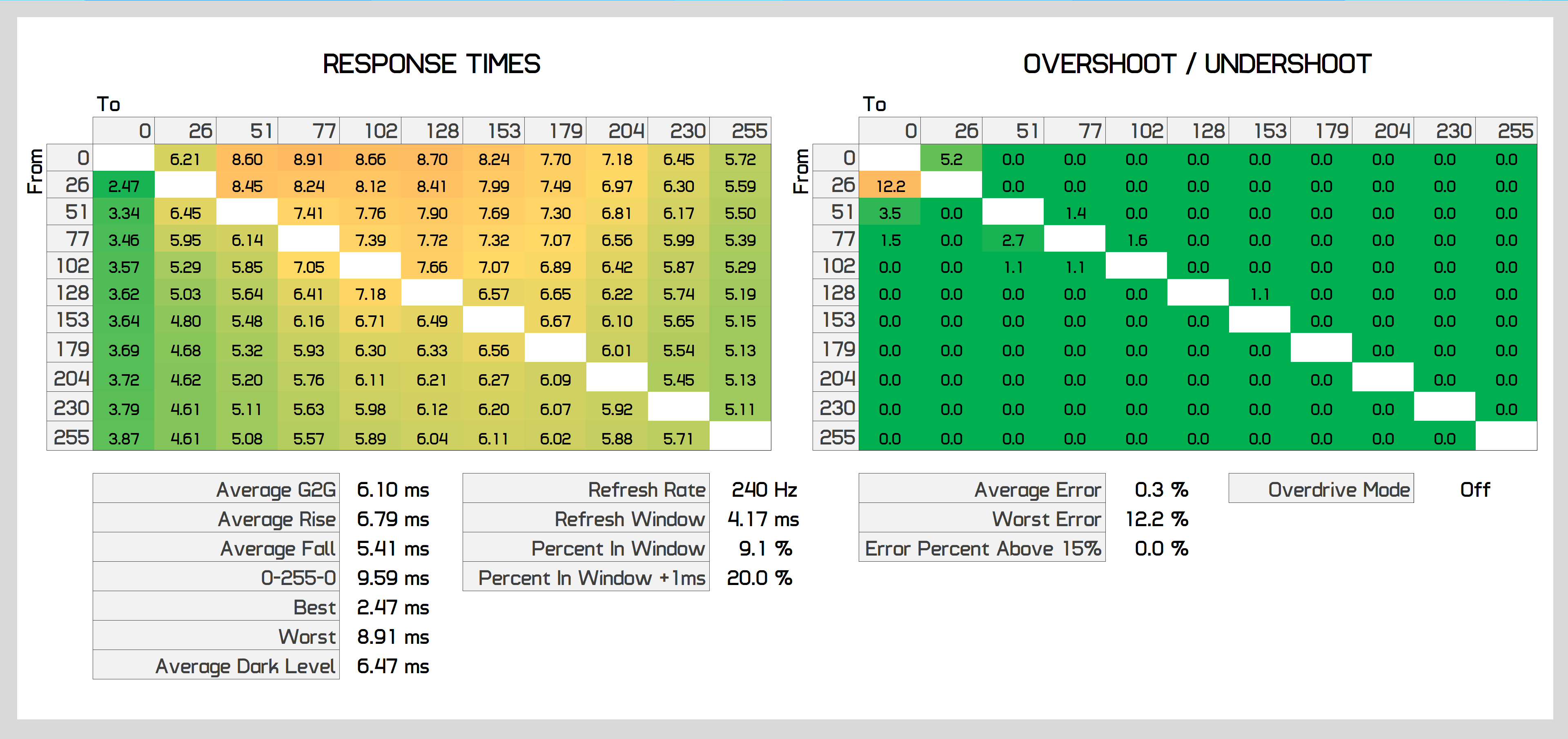 Jetons maintenant un œil à toutes les informations importantes sur le temps de réponse, en commençant par les quatre principaux modes de saturation inclus. À 240 Hz, le mode désactivé révèle des nombres de temps de réponse du stock assez décents pour ce panneau IPS, avec une moyenne de 6,1 ms de gris à gris. C'est plus rapide que beaucoup de panneaux IPS avec overdrive, donc nous sommes bien partis.