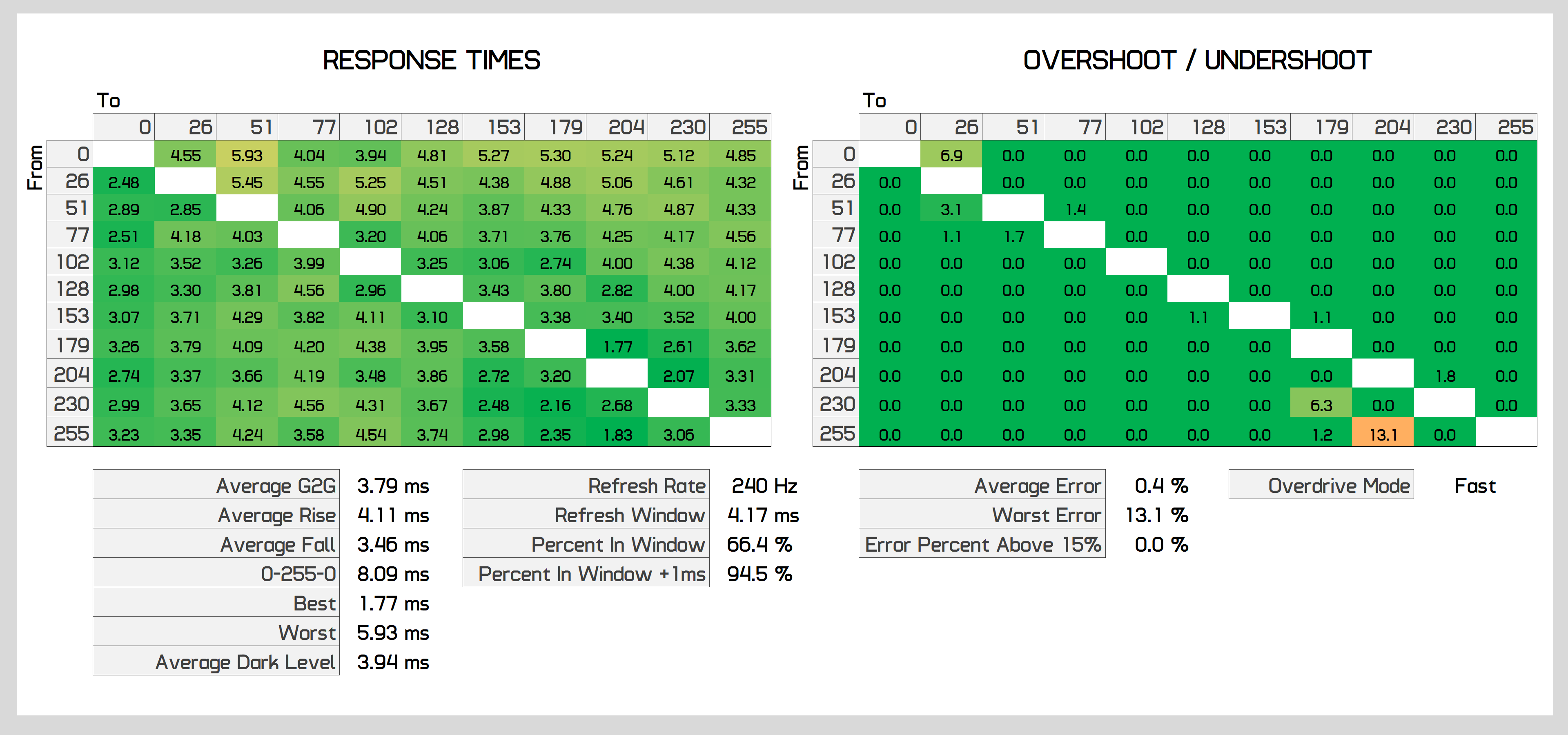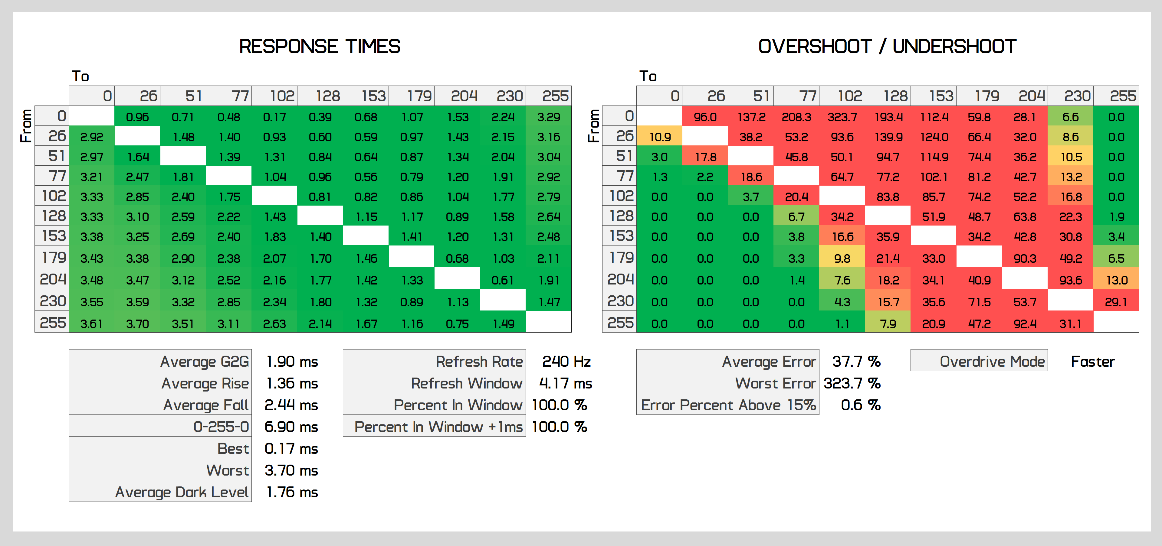 En utilisant le mode rapide, nous obtenons une amélioration marginale à une moyenne de gris à gris de 3,79 ms, toujours sans gain significatif à dépasser, c'est donc le meilleur mode à utiliser pour les jeux à 240 Hz à rafraîchissement élevé. Avec 95% des transitions conformes au taux de rafraîchissement de 240 Hz, il nous reste un moniteur IPS qui est vraiment capable de se rafraîchir à 240 Hz avec une résolution de 1080p.