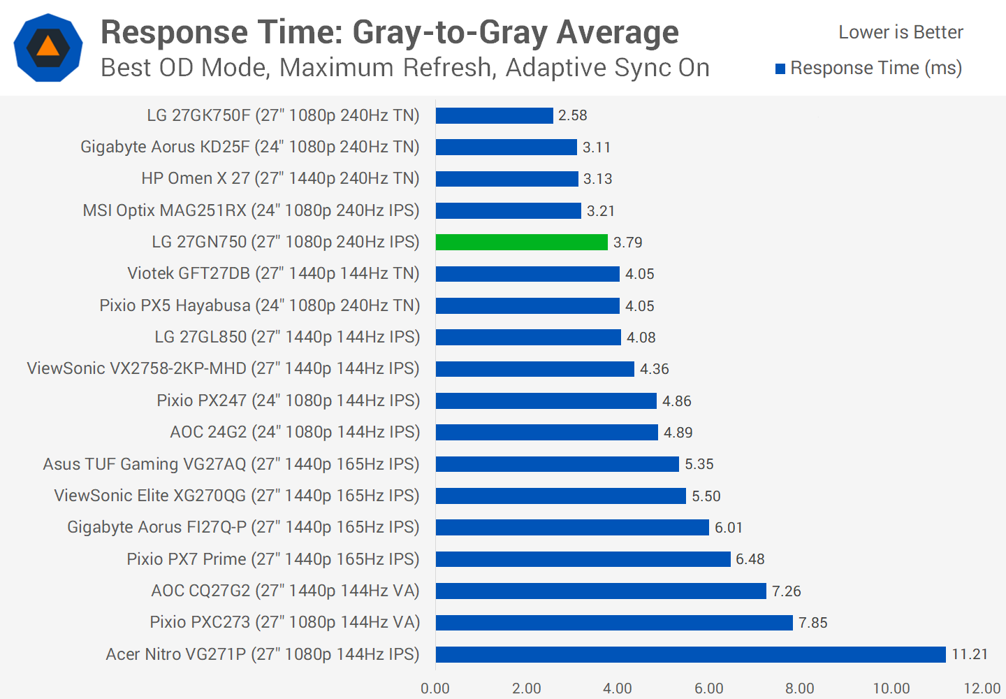 Il y avait des résultats intéressants à tirer de ce test en particulier. La première est que, bien que le panneau IPS de la classe LG 1ms soit plus rapide qu'une offre similaire d'AU Optronics, ce n'est pas beaucoup plus rapide, donc en pratique, vous vous retrouverez avec une expérience assez similaire, que vous optiez pour le 27GN750 ou une haute qualité. AU Optronics alternative comme le MSI MAG251RX. LG n'a pas autant d'avance sur ce marché 1080p 240Hz que sur le marché 1440p avec son panneau phare.