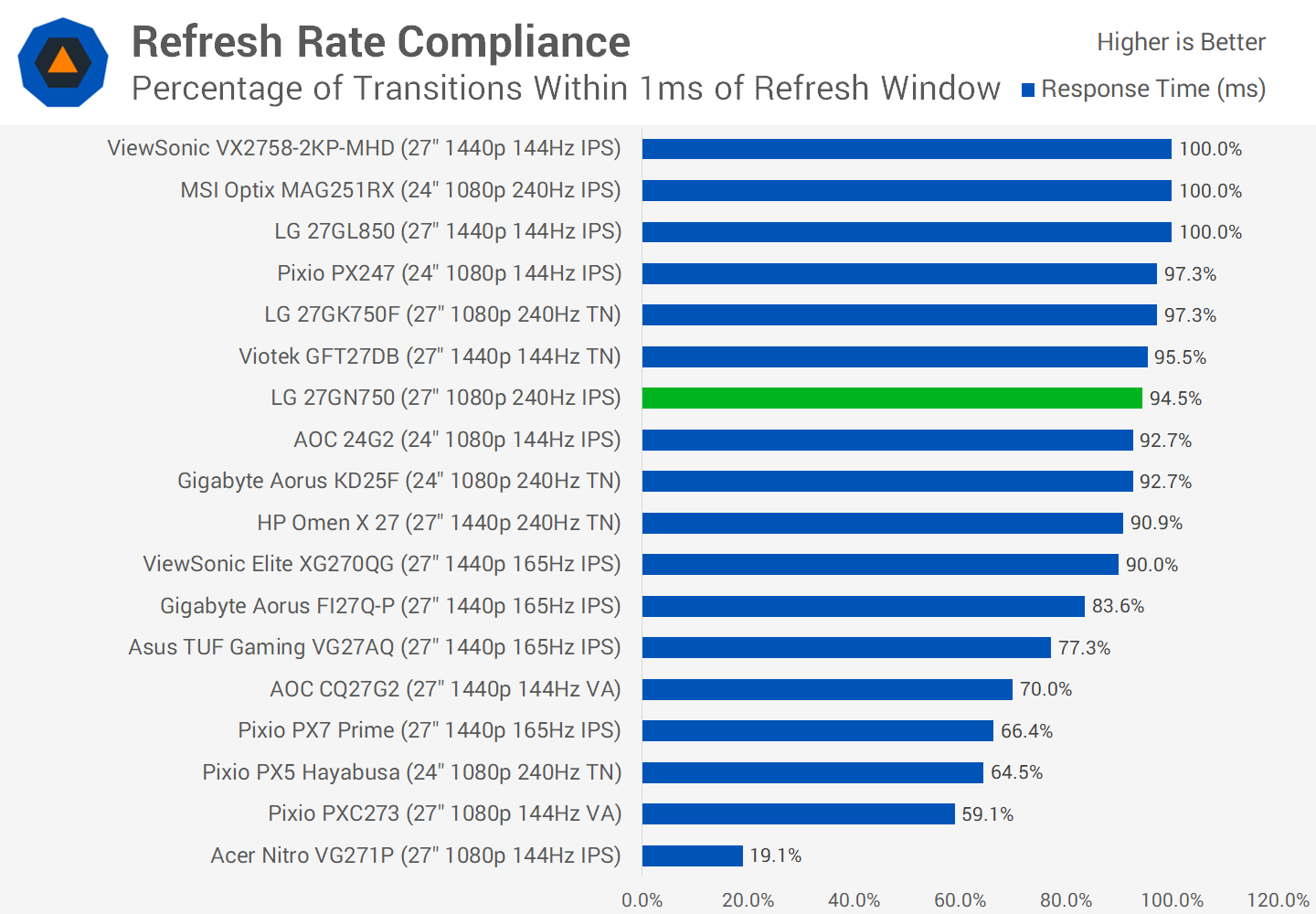 Retour aux tableaux de comparaison globale. La performance du niveau d'obscurité n'est pas un problème avec le 27GN750, l'offre de MSI est un peu mieux ajustée dans cette région, mais il n'y a pas de maculage du niveau d'obscurité ici. Nous constatons également une excellente conformité du temps de réponse pour le taux de rafraîchissement maximal, supérieur à 90%, donc ne vous inquiétez pas si l'IPS n'est pas assez bon pour 240 Hz. Cette dernière génération est certainement assez bonne.