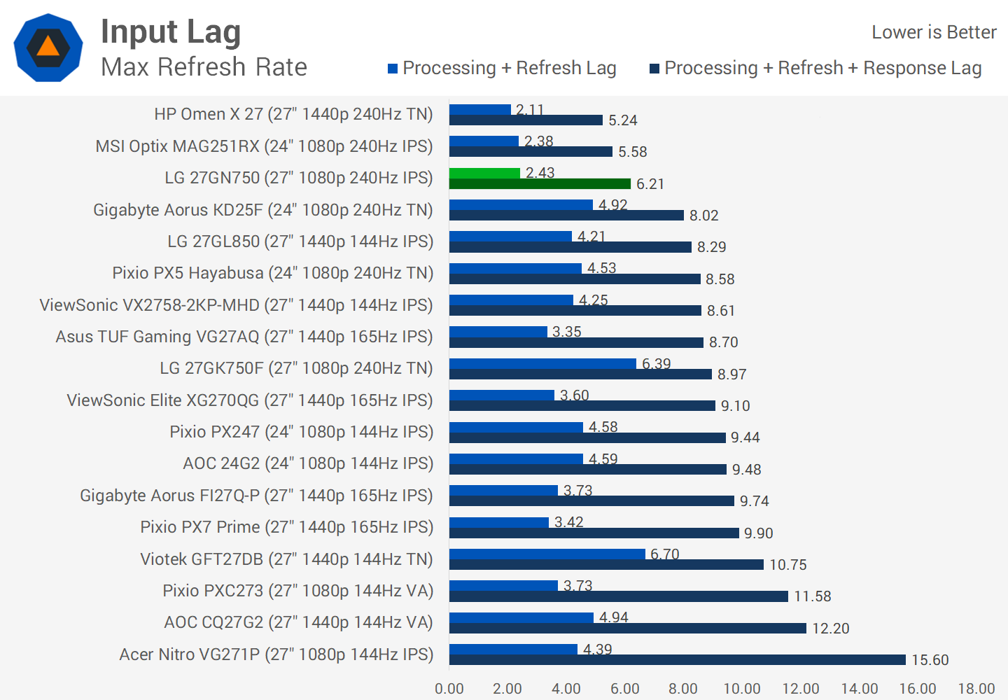 La latence d'entrée n'est pas un problème avec le 27GN750, avec un retard de traitement inférieur à 0,5 ms et un décalage total dans la chaîne autour de la marque de 6 ms. Il s'agit d'un écran très réactif qui se sent rapide à utiliser à tous égards, il a juste une de ces excellentes combinaisons de faible retard d'entrée, taux de rafraîchissement élevé et bons temps de réponse.