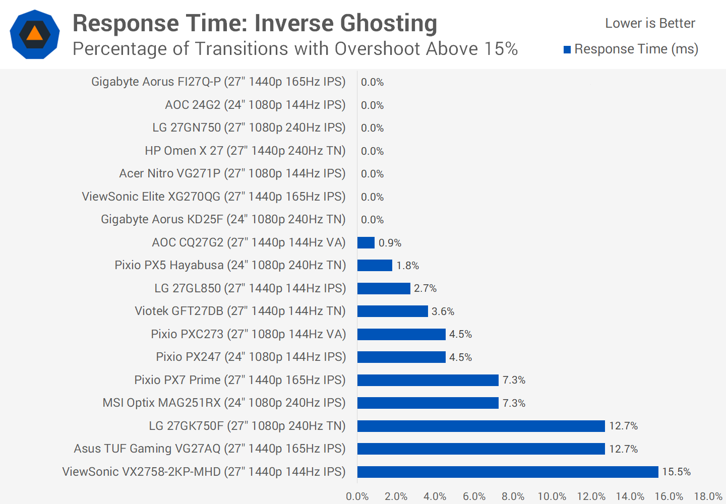 Comme la plupart des récents moniteurs de classe 1 ms de LG, ils trichent essentiellement pour répertorier cela comme un moniteur 1 ms. J'ai pu atteindre une moyenne de gris à gris de 1,9 ms en utilisant le mode overdrive plus rapide, avec des transitions inférieures à 1 ms, le niveau de dépassement ici est très élevé, avec une erreur moyenne de 38% et avec 55% des transitions présentant de graves images fantômes inverses . Bien qu'il atteigne 1 ms ou environ, ce mode est inutilisable en raison des traînées lumineuses qu'il produit dans la pratique.