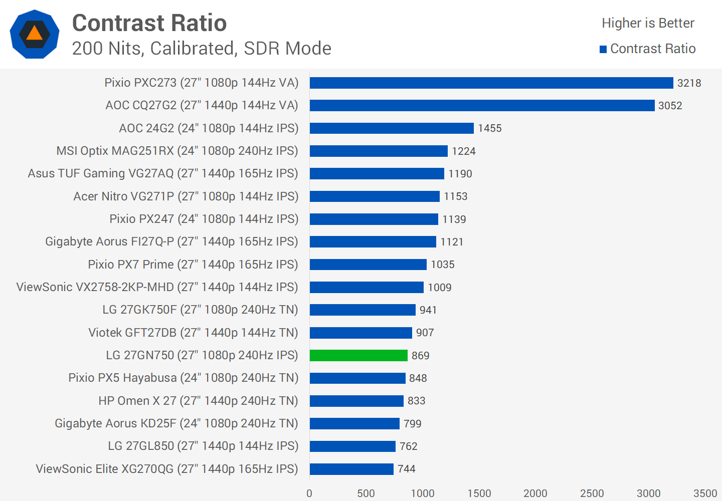 La luminosité de pointe est moyenne à environ 350 nits après l'étalonnage, ce qui convient à la plupart des conditions de visualisation. En ce qui concerne le contraste… eh bien, c'est un domaine avec lequel les panneaux IPS de classe 1ms de LG ont eu du mal, le 27GL850 est un résultat particulièrement médiocre. Le 27GN750 n'est pas aussi mauvais que le 27GL850, mais avec un rapport de contraste inférieur à 900: 1, les niveaux de noir et le contraste sont toujours une faiblesse pour ce type de panneau. En particulier, vous pouvez voir l'équivalent AU Optronics près du haut des graphiques du MAG251RX, qui produit un rapport de contraste de 40% plus élevé, plus conforme à ce que nous attendons normalement d'un IPS moderne.