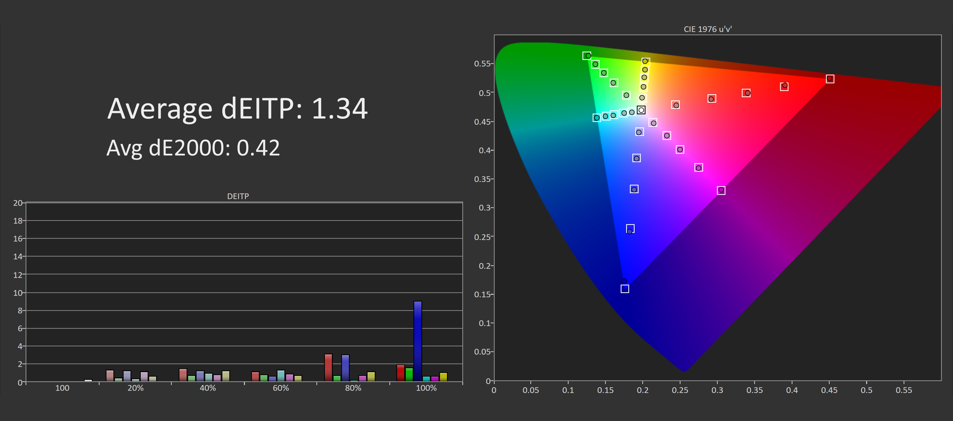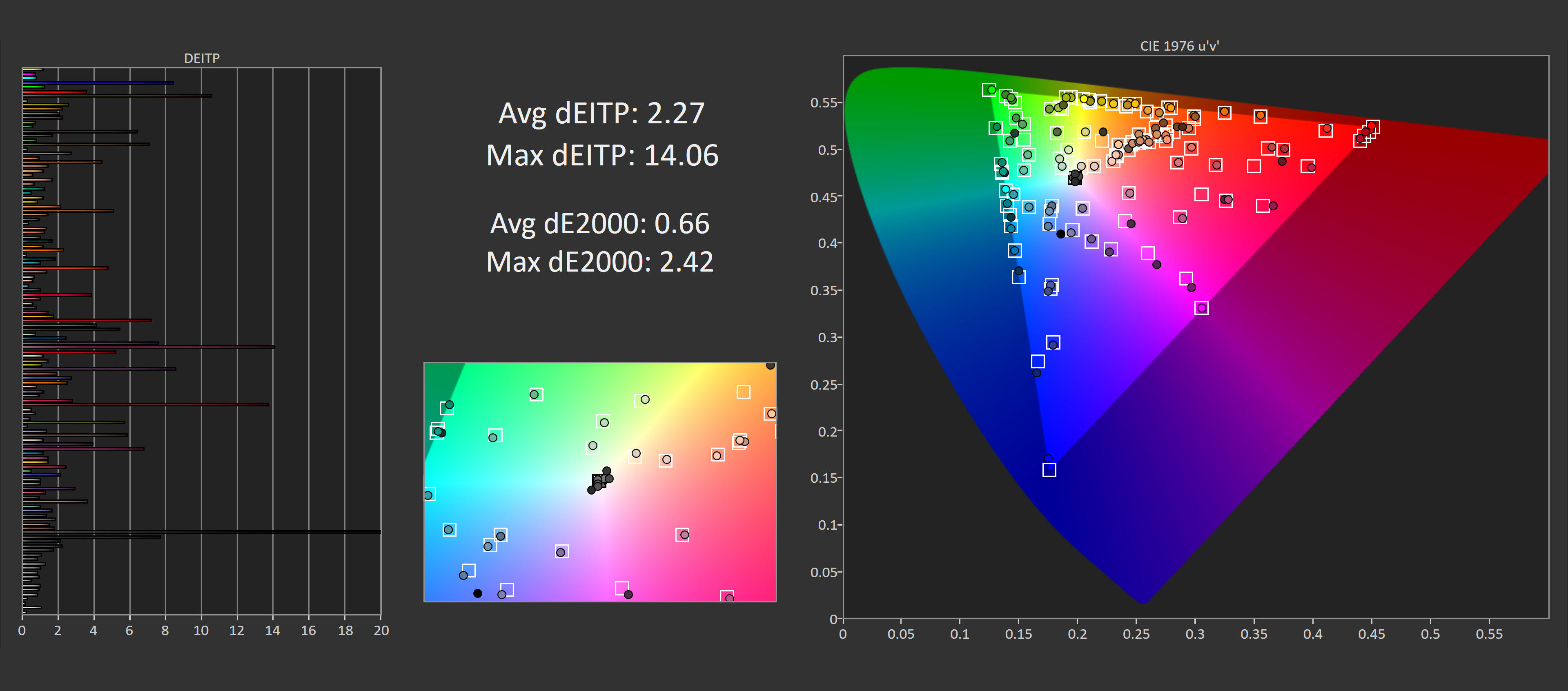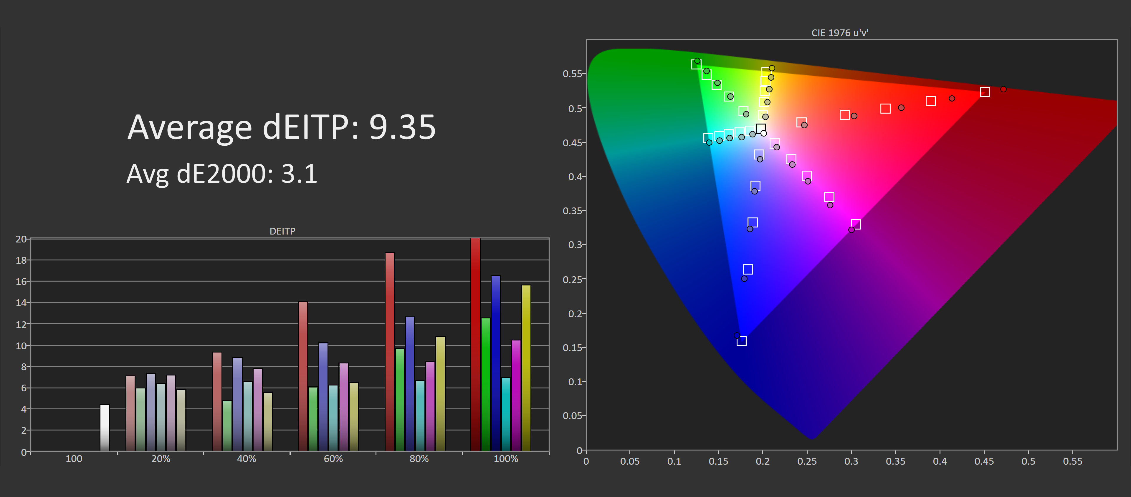Avec un point blanc incorrect, ces erreurs continuent dans nos tests de couleur comme la saturation. Un dE de 9,35 est assez élevé en utilisant la nouvelle métrique ITP, mais même avec l'ancienne formule, nous recherchons toujours des performances qui ne sont pas entièrement précises. Nous nous retrouvons avec des performances moyennes pour un écran de jeu. Rien de bien nouveau dans le test ColorChecker non plus, ce sont des résultats moyens.