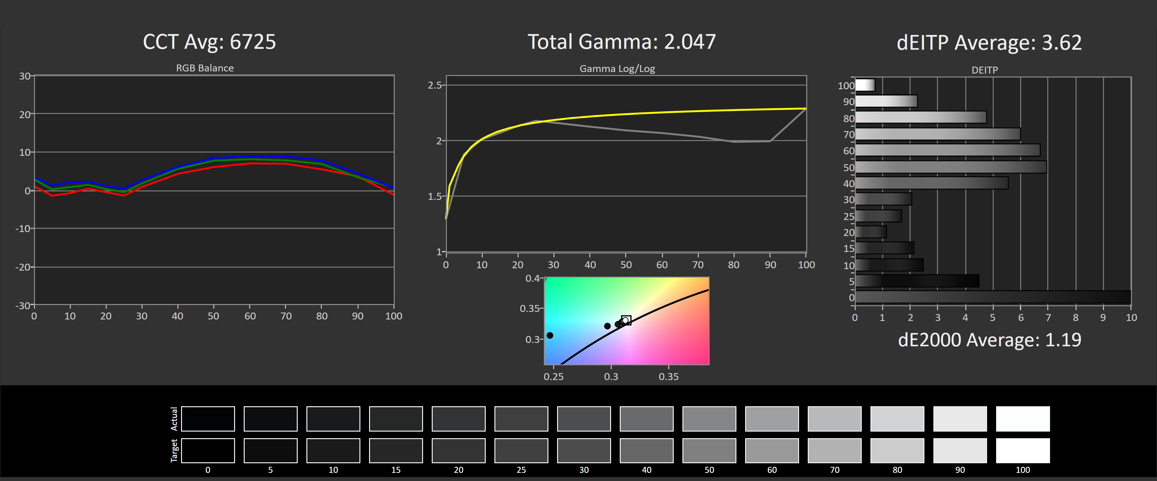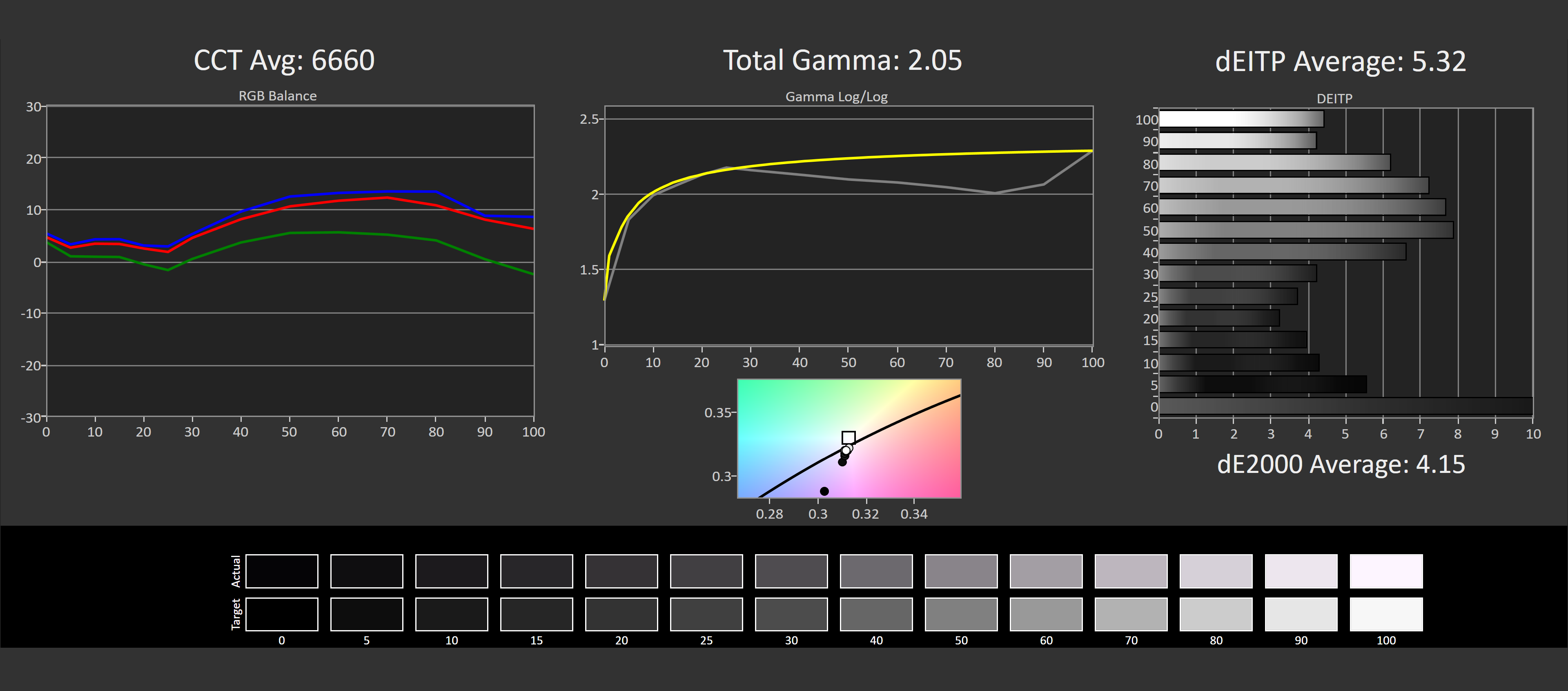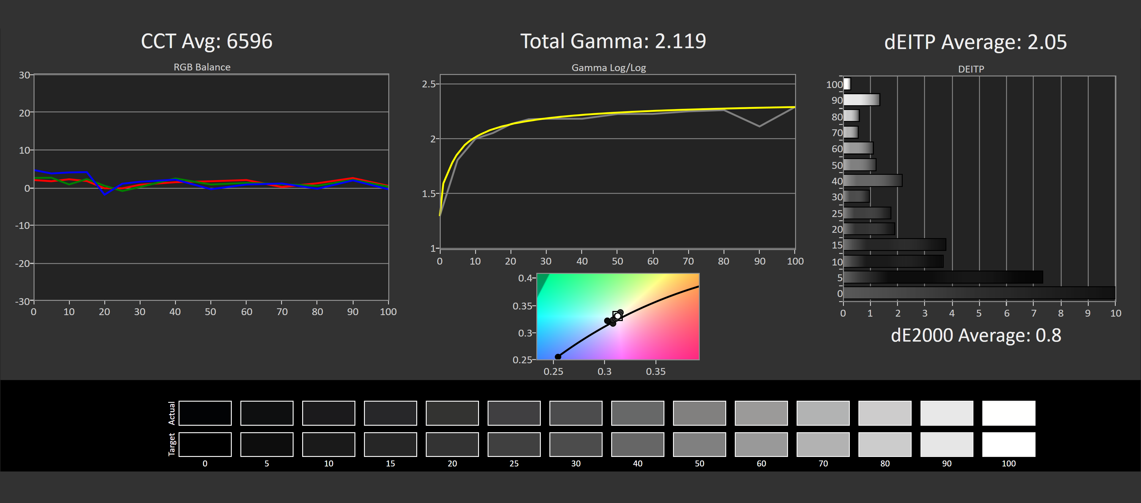 Notre unité avait un léger ton rose hors de la boîte, mais rien hors de l'ordinaire. La courbe moyenne CCT est raisonnablement bonne mais il y a quelques problèmes avec un gamma faible comme vous pouvez le voir dans la courbe gamma. Cela conduit à des performances deltaE élevées dans ces tons moyens supérieurs, il ne s'agit donc pas d'un affichage particulièrement précis prêt à l'emploi pour les niveaux de gris.