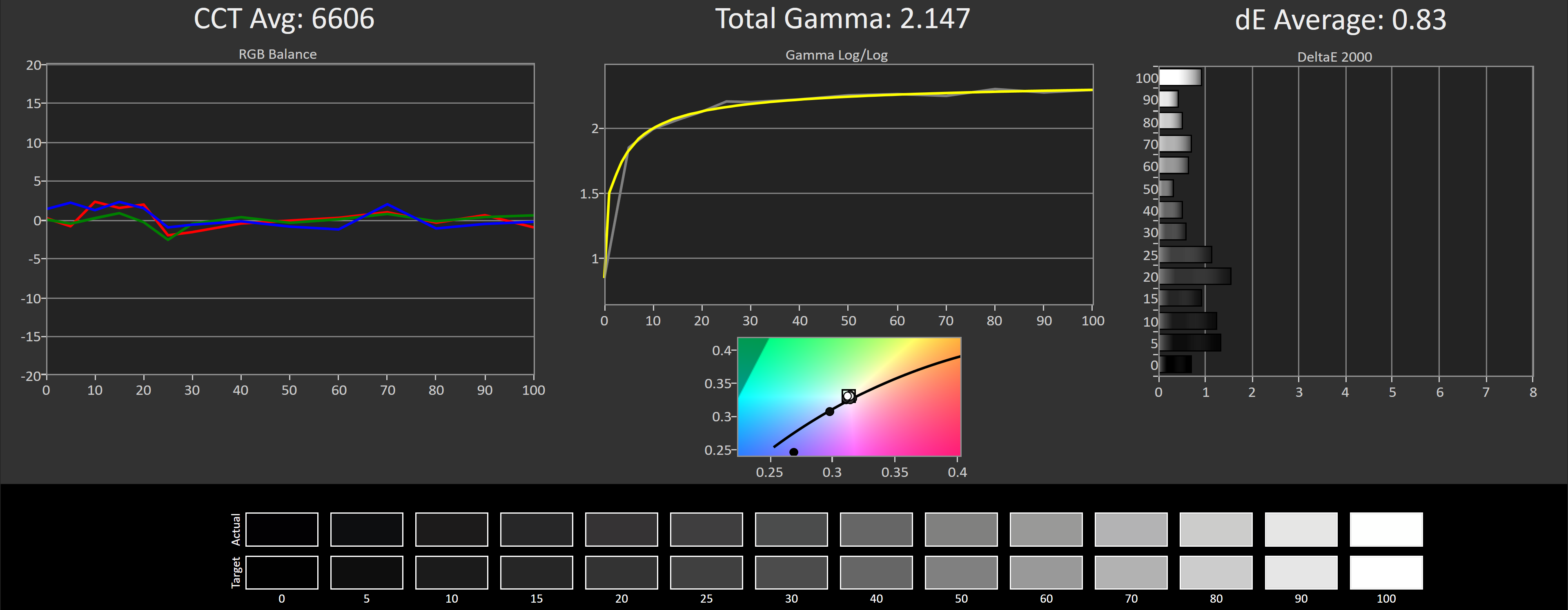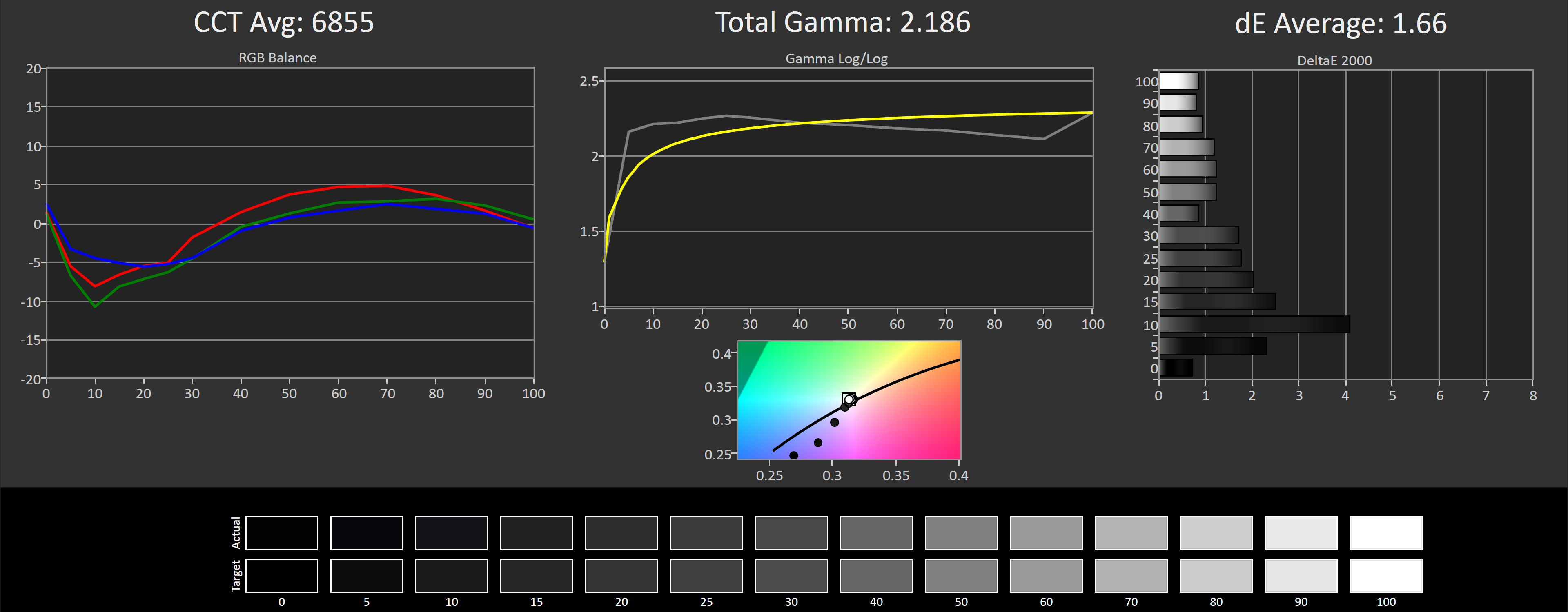 Avec ces paramètres appliqués et aucun calibrage formel, la courbe CCT s'est considérablement améliorée pour atteindre une moyenne de 6855K, ce qui a conduit à une moyenne deltaE en niveaux de gris de seulement 1,66, ce qui est diablement précis pour quelques ajustements précis. Cela a beaucoup aidé avec la saturation, conduisant à une moyenne deltaE de 1,39 et aux améliorations de ColorChecker à 1,53. Avec des moyennes inférieures à 2,0 dans l'ensemble, ce type de performance est très précis.
