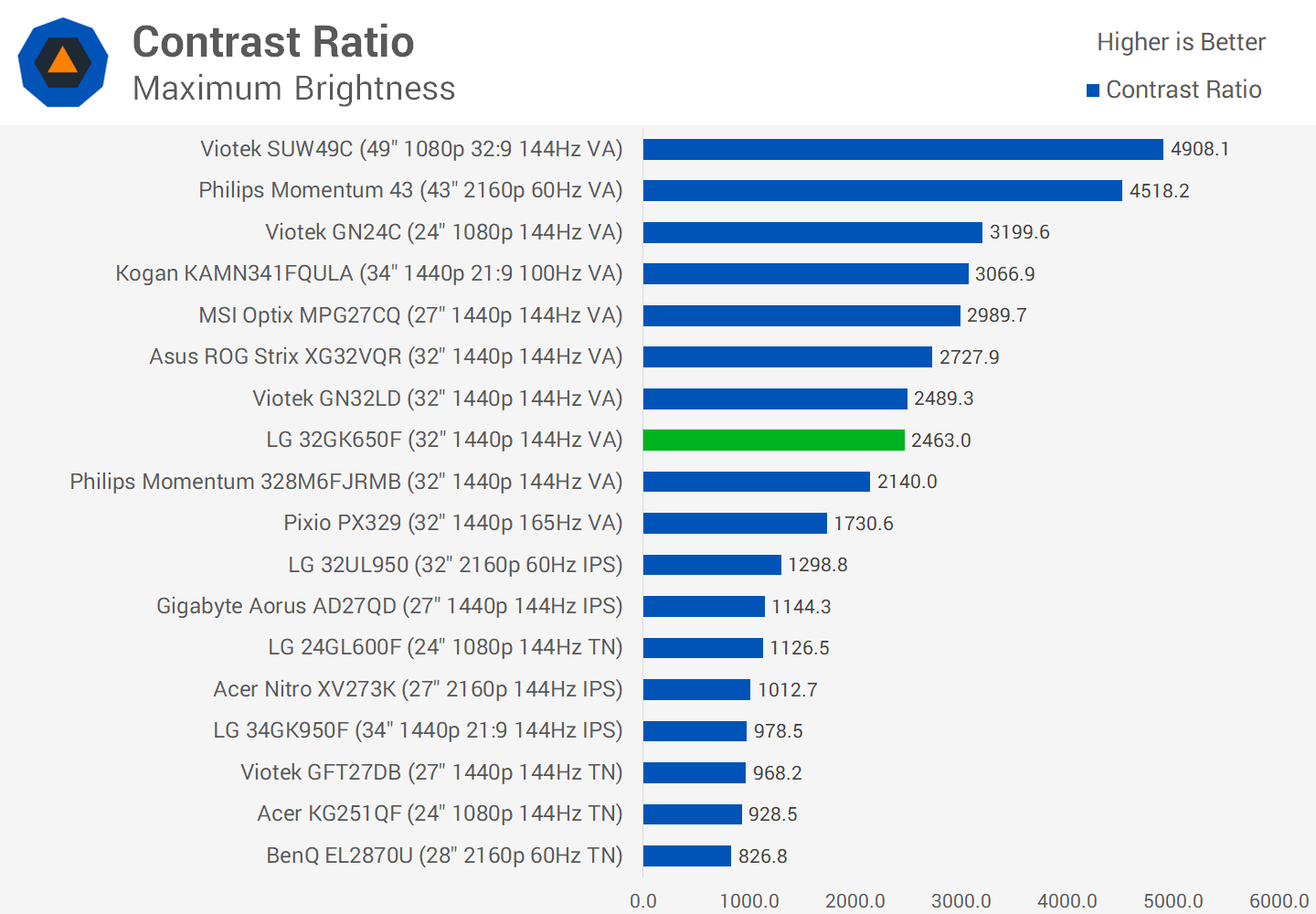 LG indique un rapport de contraste typique pour cet écran de 3000: 1, bien que lors de nos tests, nous ayons enregistré quelque chose de plus proche de 2400: 1, ce qui est un peu plus bas mais pas inhabituel pour ce type de VA. Avec ce résultat, il reste toujours assis autour de ses concurrents. toutes les marques situées sous 3000: 1 également. Même à 2400: 1, le rapport de contraste est au moins le double d'un IPS typique et vous apportera tout de même les avantages en termes de contraste de cette technologie. En ce qui concerne la luminosité, 320 nits conviennent à la plupart des téléspectateurs, d’autant plus qu’il n’ya pas de support HDR.