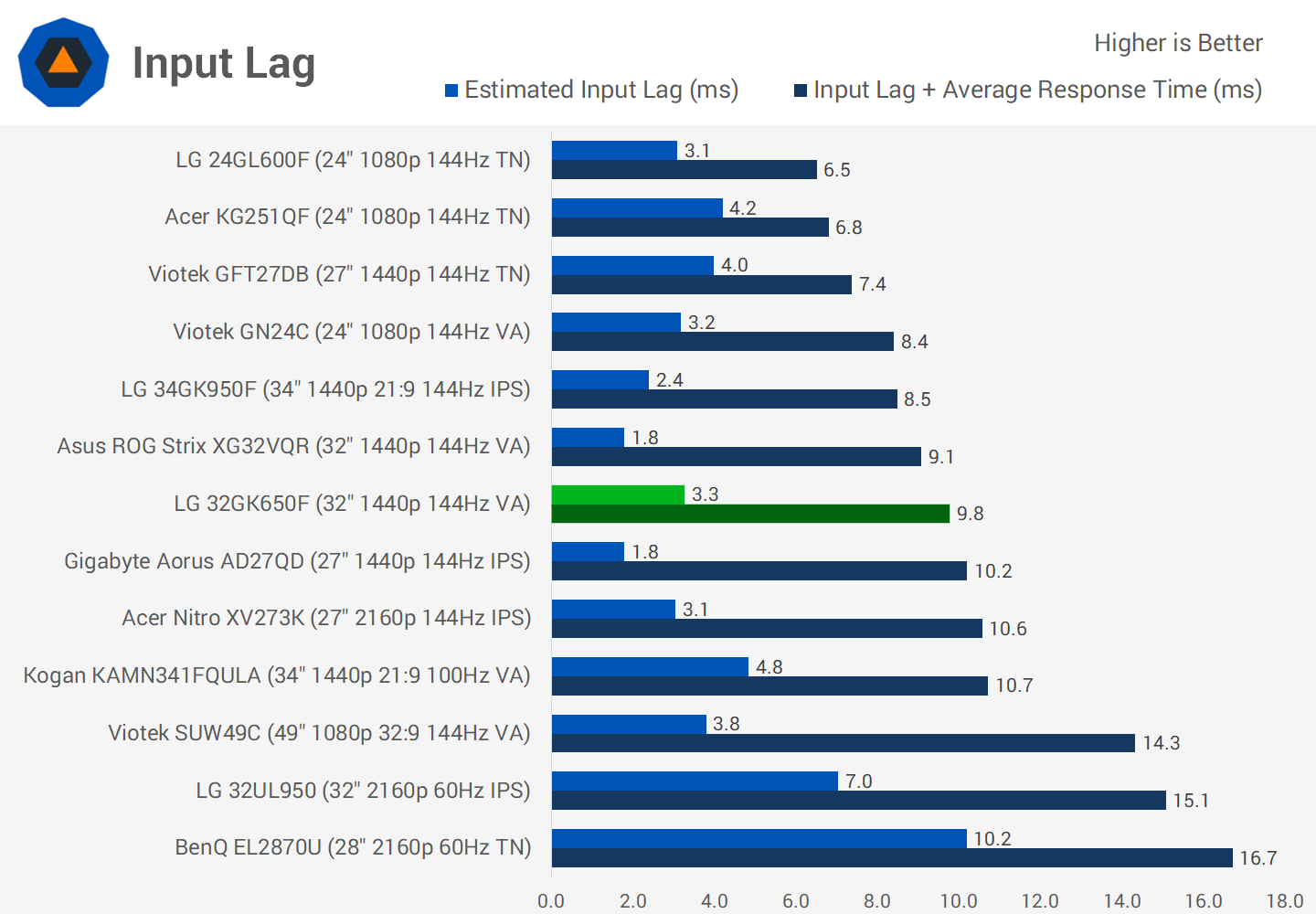 Le délai d'entrée est également correct, à 3,3 ms, ce qui se situe dans la fourchette normale observée pour les moniteurs de jeu. Cela donne une latence globale inférieure à 10 ms, ce que nous aimons voir.