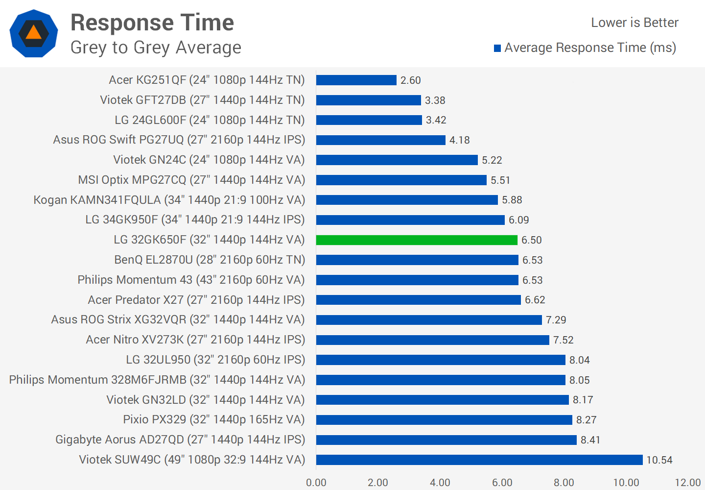 En regardant les graphiques, vous constaterez que parmi les moniteurs VA 1440 1440p 144Hz 32 pouces que nous avons examinés – il y en a eu quelques-uns, il s’agit d’un type de produit populaire – le 32GK650F est le plus rapide. Le temps de réponse moyen pour ce type est de 7,7 ms. Nous sommes donc environ 1 ms plus rapides que prévu. C’est un excellent résultat pour un VA et le place sur le territoire d’IPS.