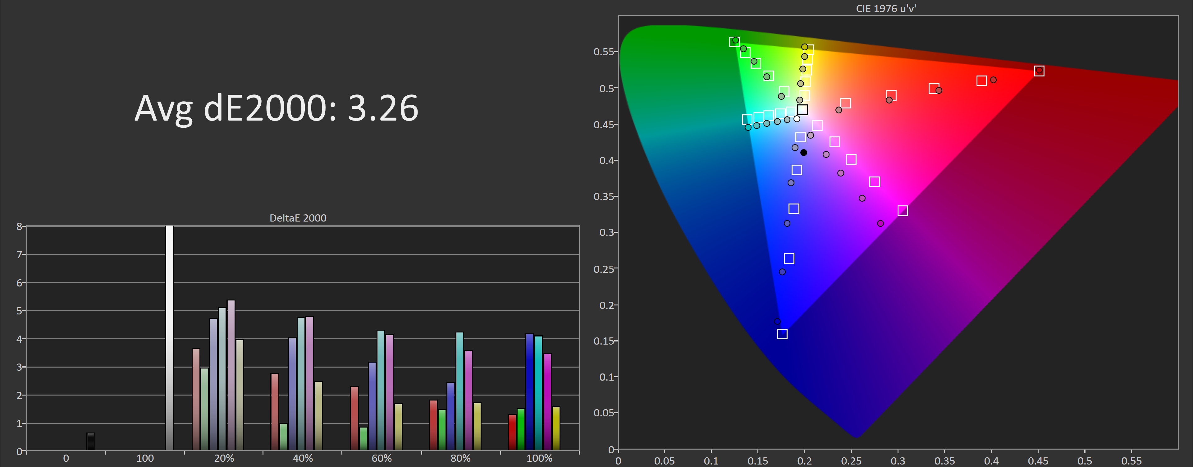 C’est une histoire similaire avec des performances de saturation, avec un point blanc froid qui permet de voir que le reste des points de couleur a été traduit, de sorte que tout a été déplacé plus froid que prévu. Nous obtenons une moyenne deltaE de 3,26 avec des performances particulièrement médiocres en bleu, cyan et magenta. Et vous verrez des numéros similaires avec ColorChecker.