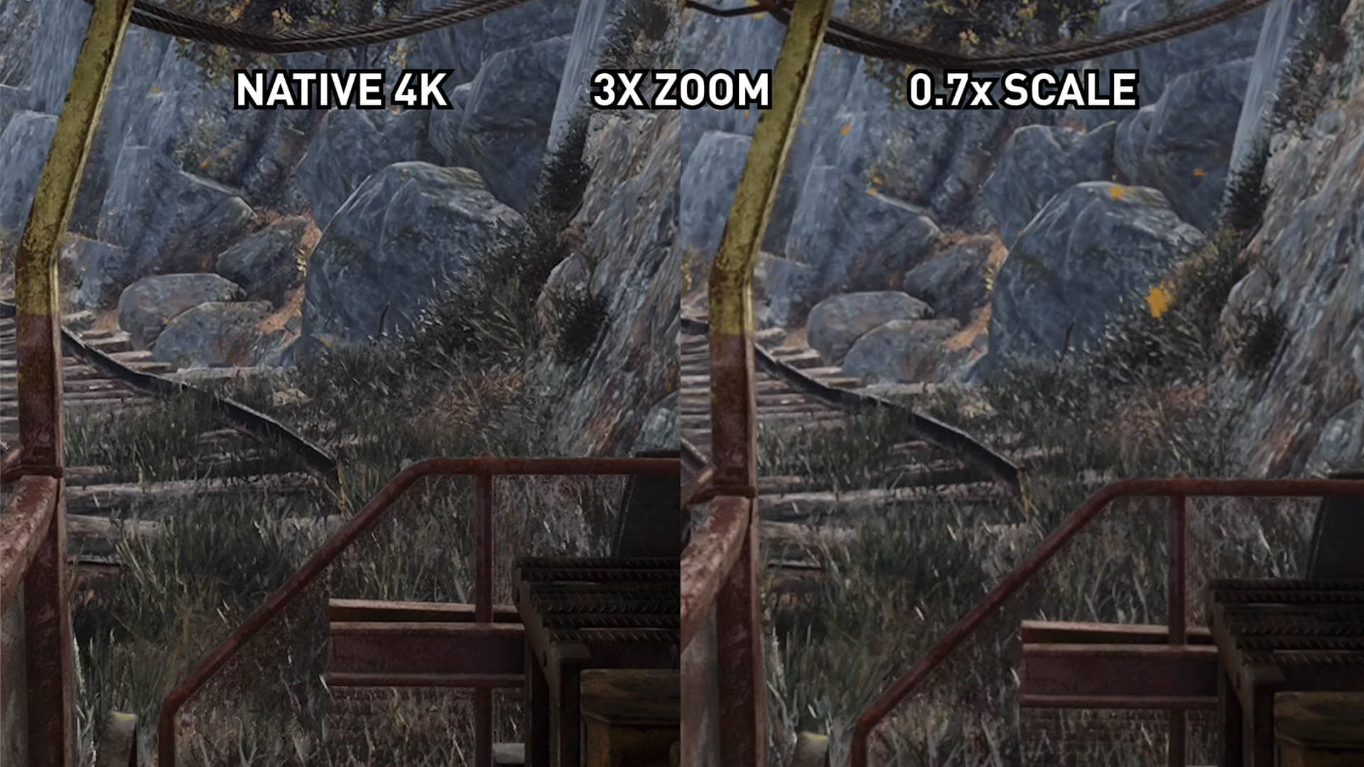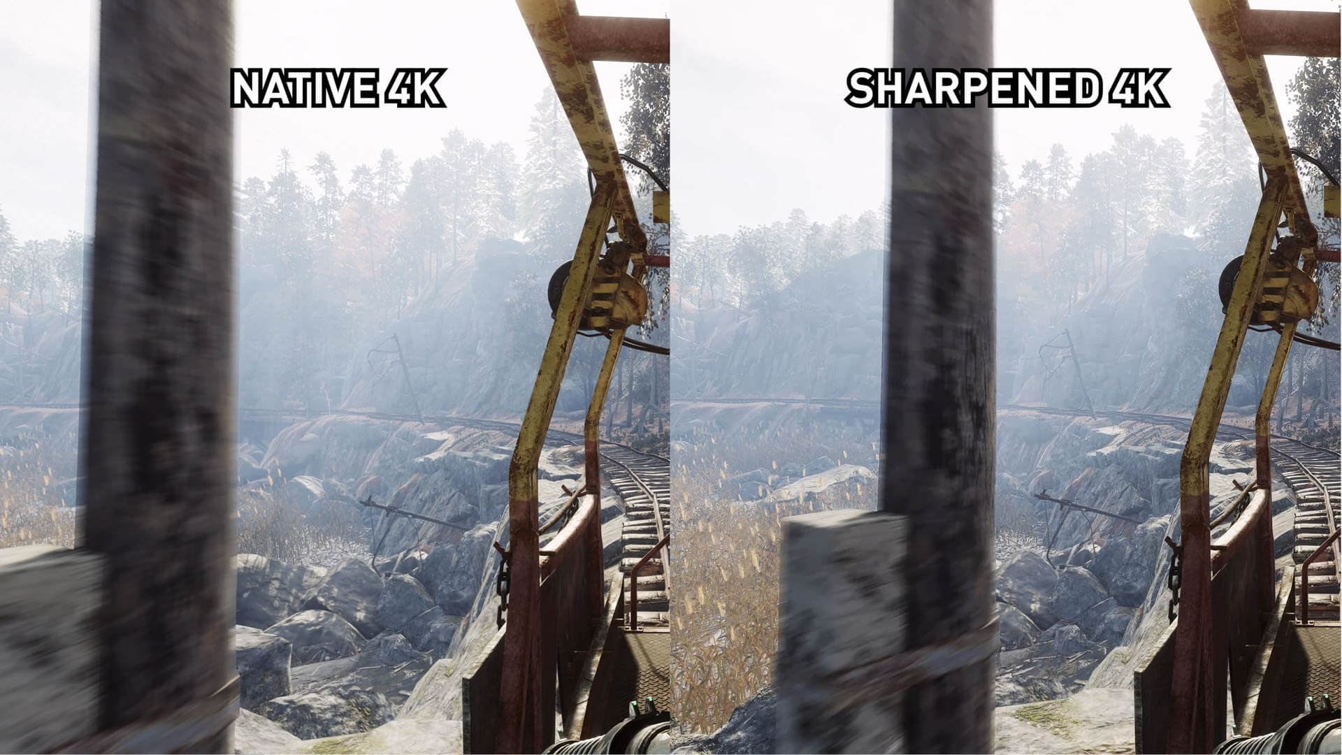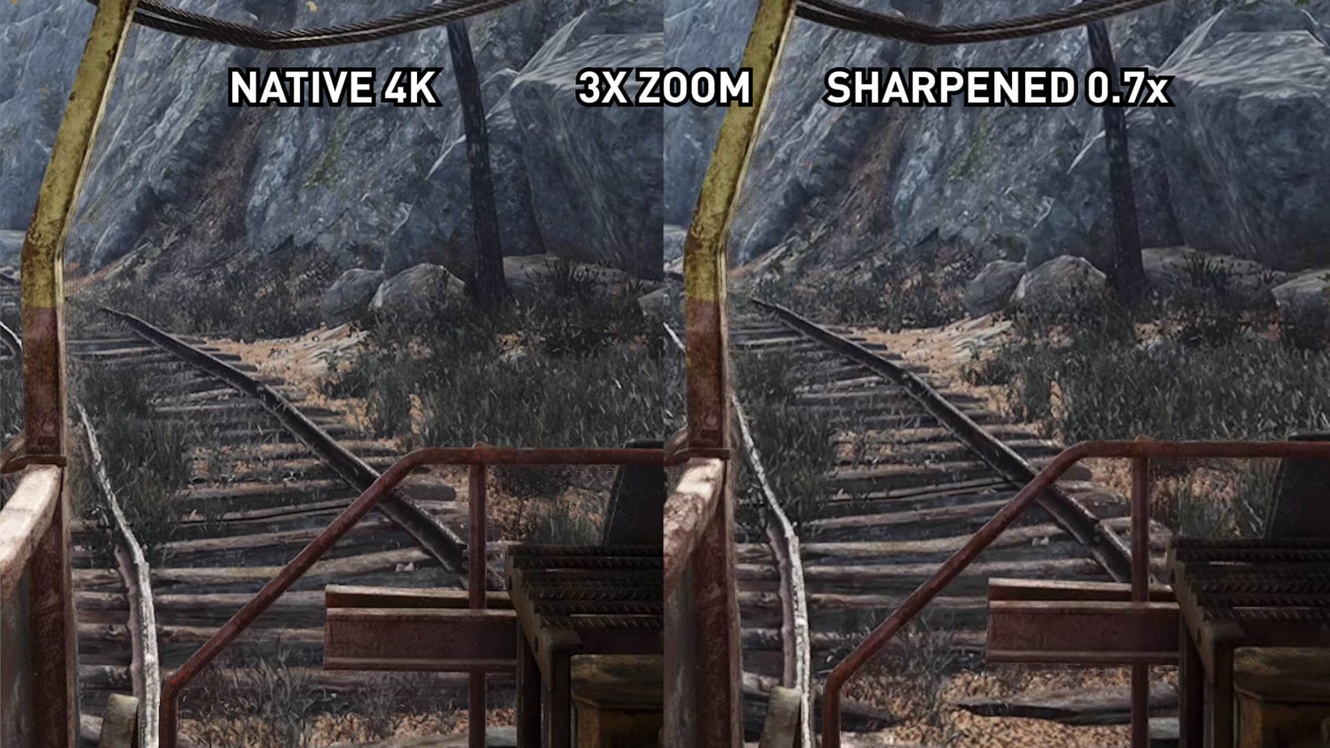Cela dit, il y a des failles qui ne doivent pas être ignorées. Dans l’ensemble, l’image est plus nette; Dans cette scène, si je zoome sur le feuillage fin, il est plus clair quand il est aiguisé. Il en va de même pour les voies ferrées et certains autres domaines. Ce n’est probablement pas quelque chose que vous remarquerez si ce n’était pas pour cela côte à côte, mais cela semble être un artefact du filtre.