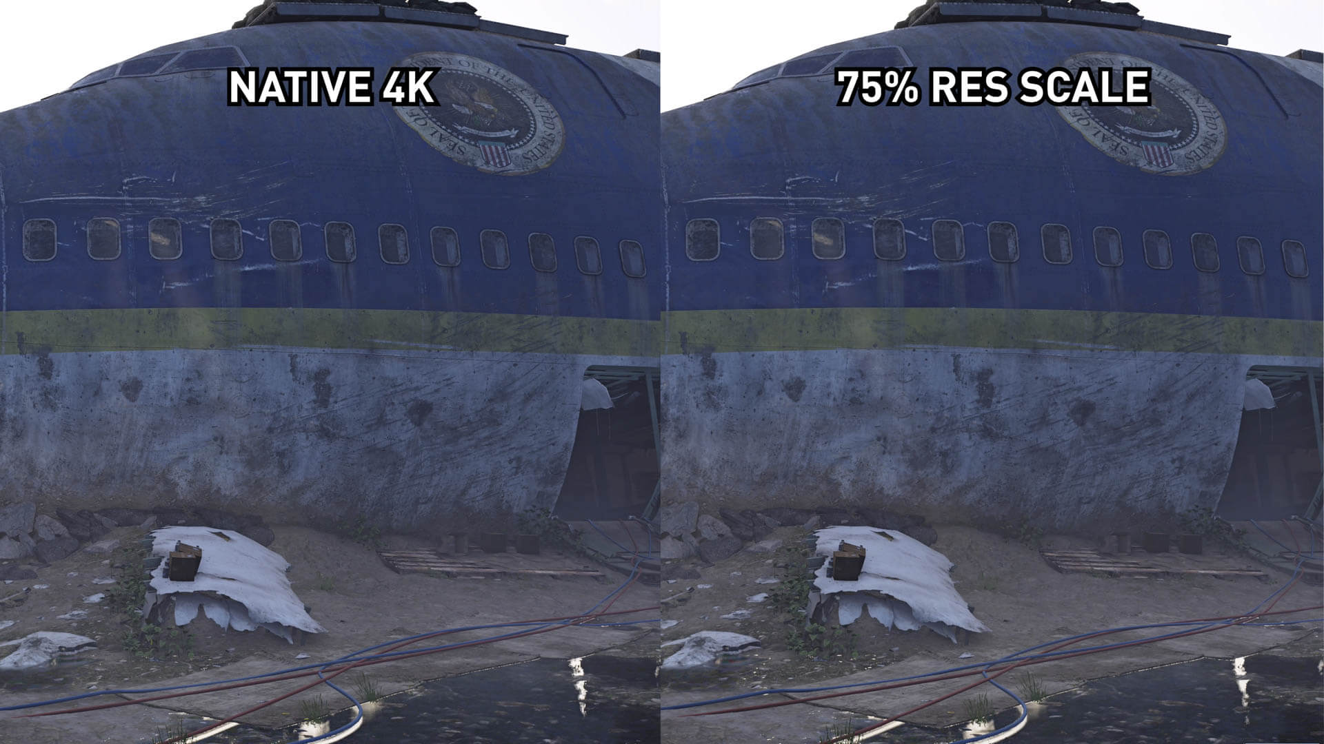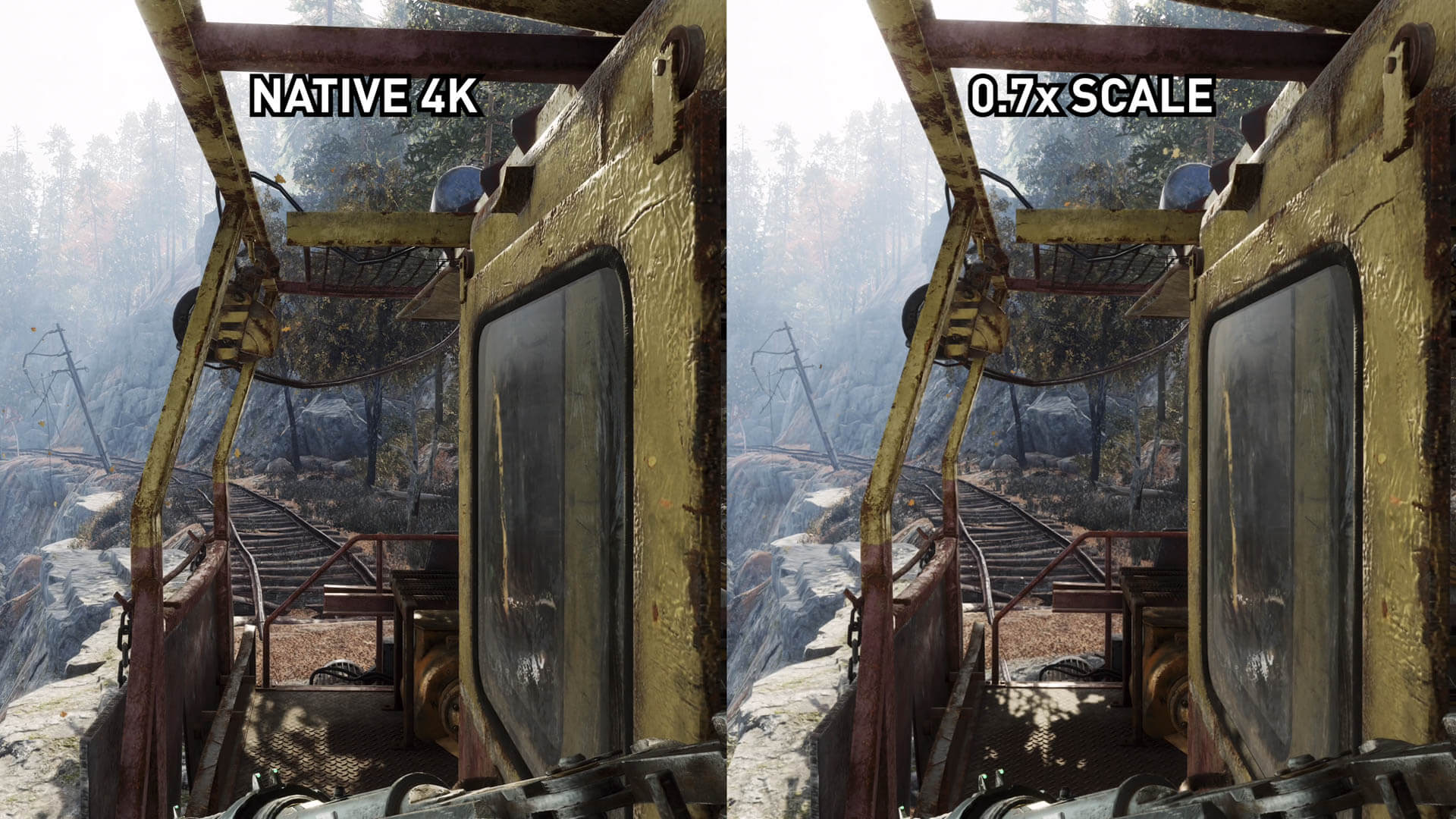 Cependant, nous obtenons des résultats différents lors du sous-échantillonnage dans la plage de 1800p. Dans Metro Exodus, nous définissons une échelle de shader de 0,7x, ce qui équivaut à environ 1800p. Sans accentuer l'image 1800p est évidemment plus douce que la 4K native. Ce n’est pas aussi grave que 1440p, mais vous perdez toujours en netteté et en détail par rapport à une résolution native.