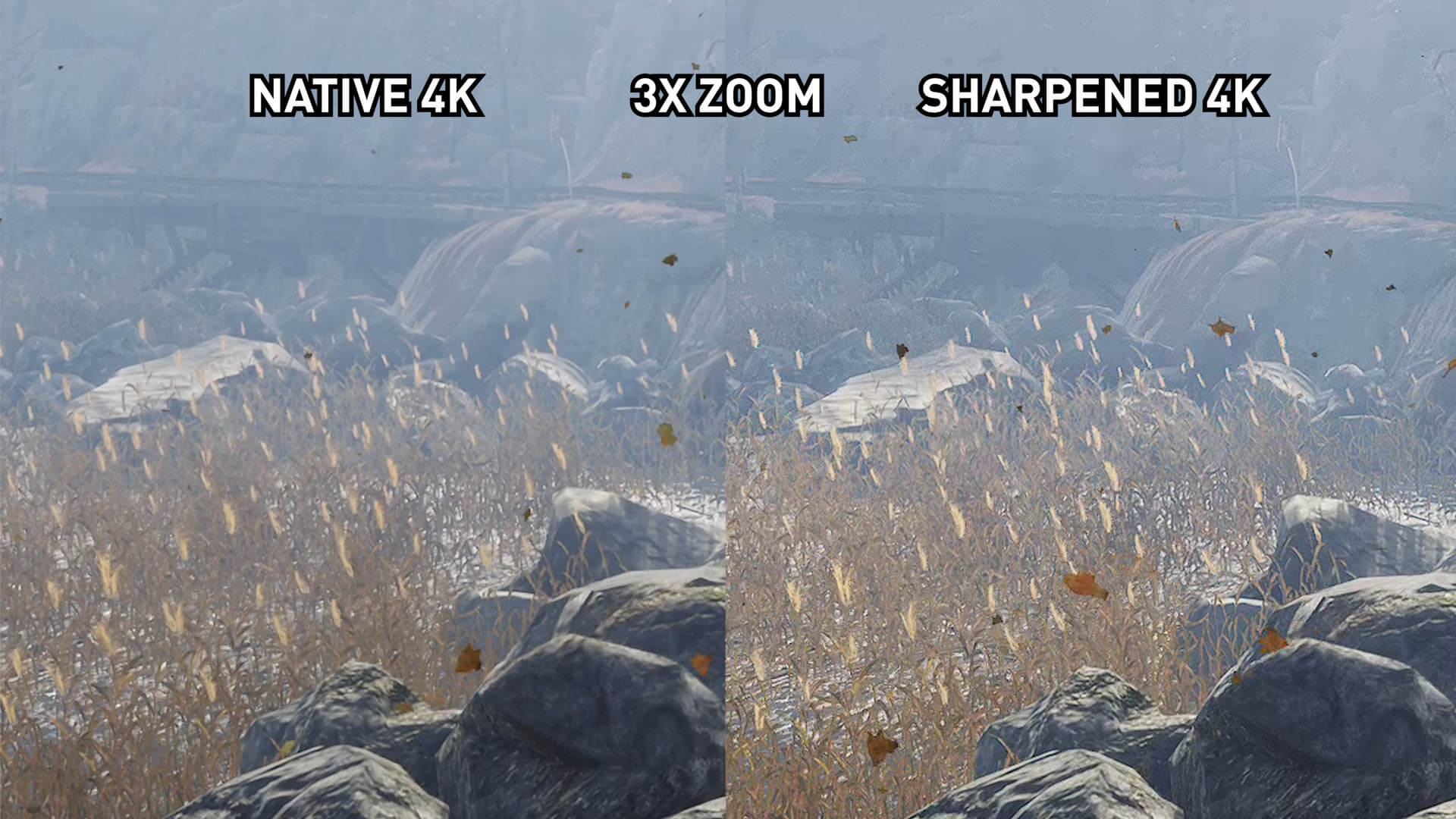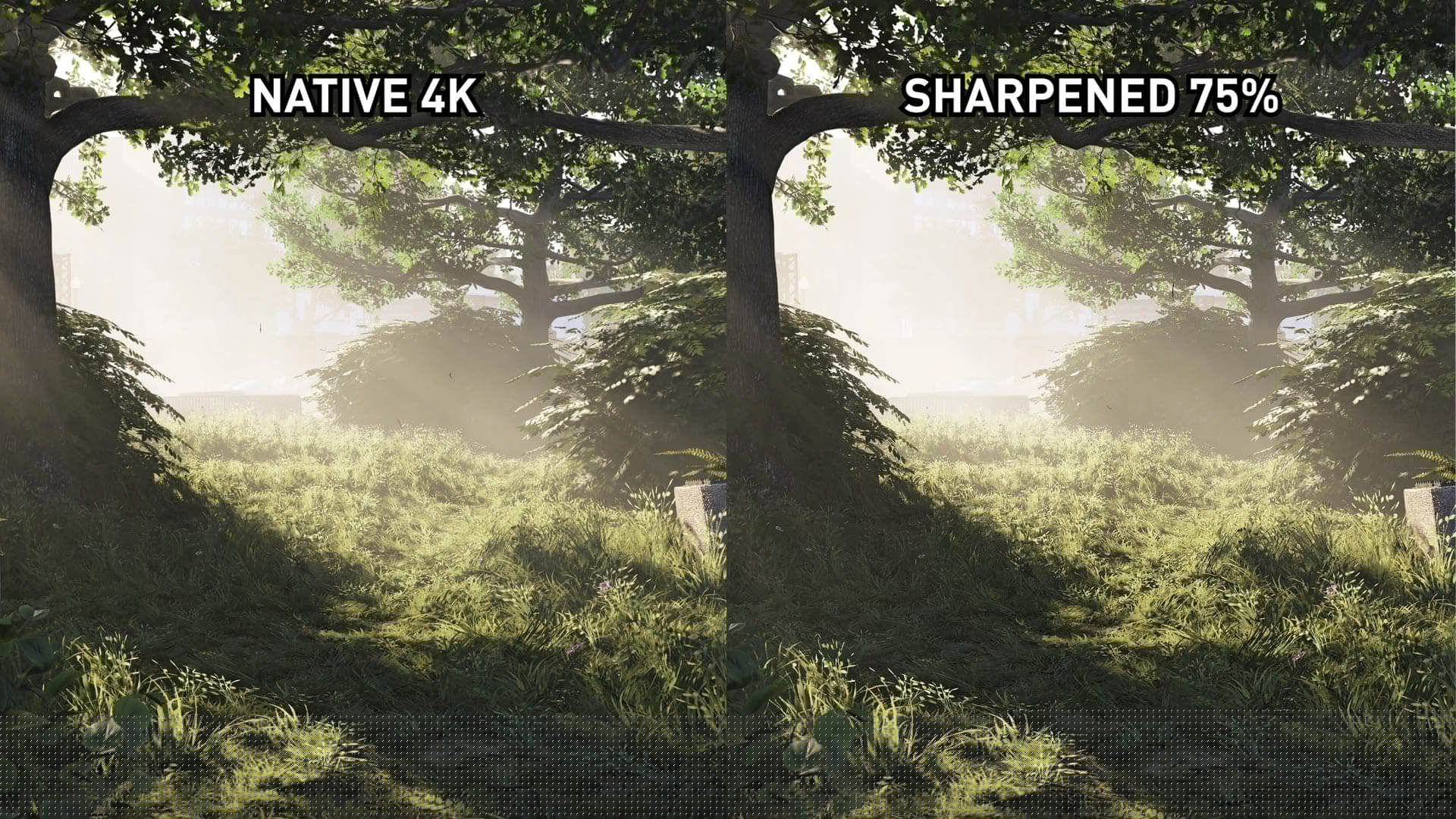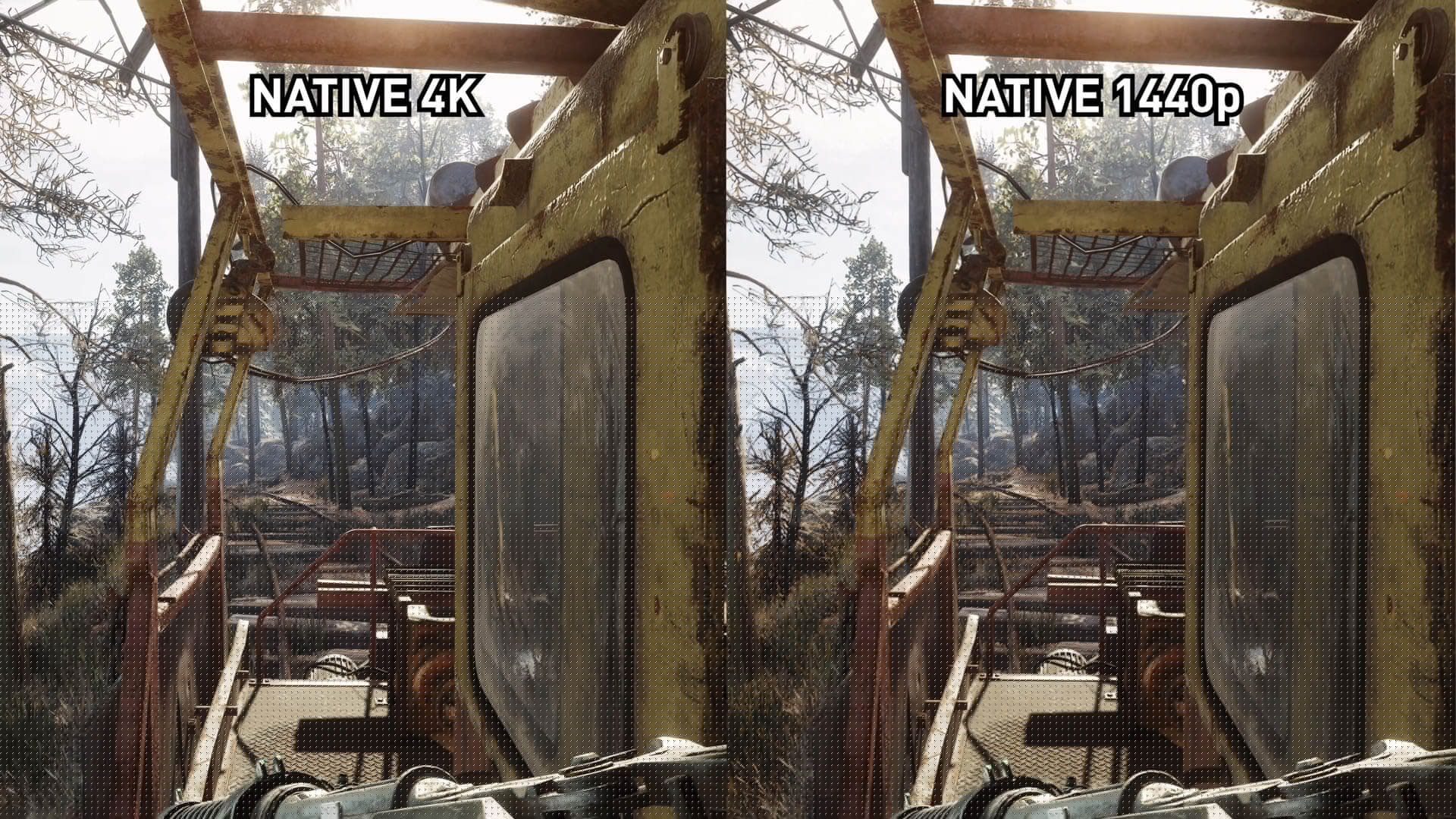 L’image 1440p accentuée est une grande amélioration par rapport à l’image 1440p native, mais n’a finalement pas le même niveau de détail que l’image 4K native. Les textures proches deviennent assez proches, mais avec certains détails de feuillage fins et d’autres petits éléments, il n’ya tout simplement pas assez de pixels et de détails natifs dans l’image 1440p pour simuler une présentation 4K via un filtre de post-traitement.