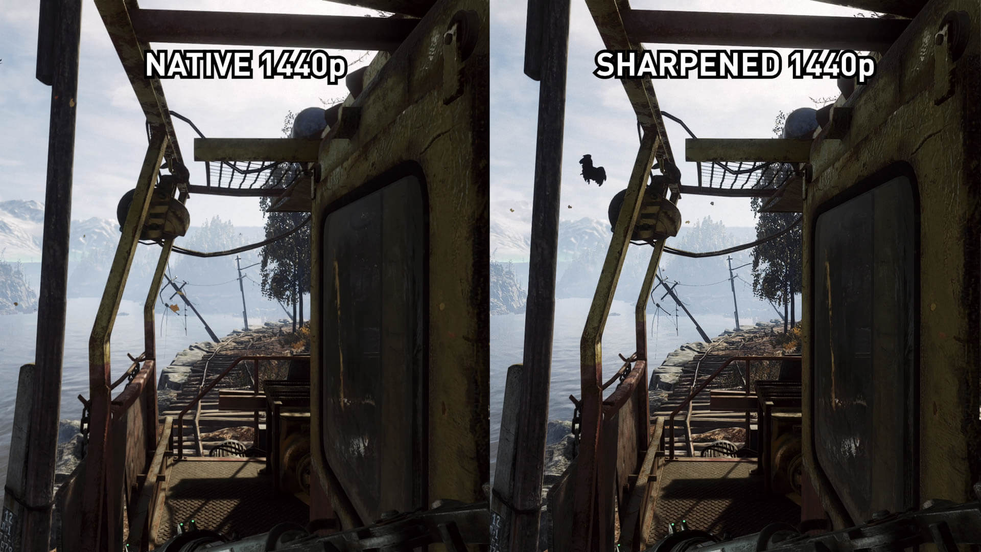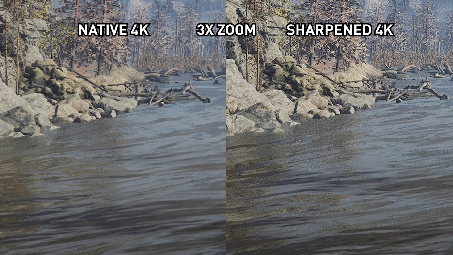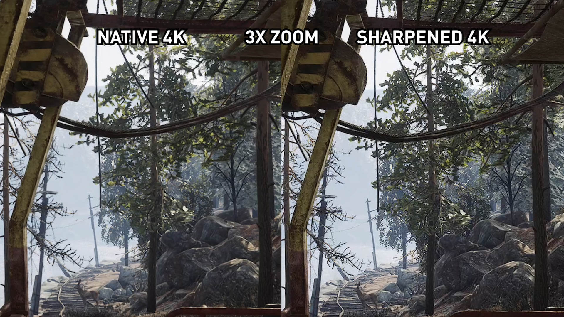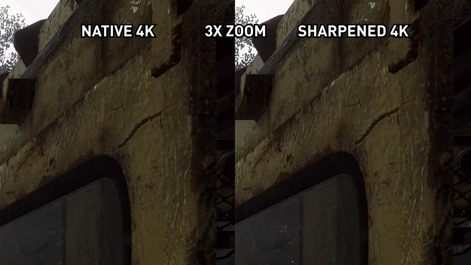 L’image 1440p accentuée est une grande amélioration par rapport à l’image 1440p native, mais n’a finalement pas le même niveau de détail que l’image 4K native. Les textures proches deviennent assez proches, mais avec certains détails de feuillage fins et d’autres petits éléments, il n’ya tout simplement pas assez de pixels et de détails natifs dans l’image 1440p pour simuler une présentation 4K via un filtre de post-traitement.