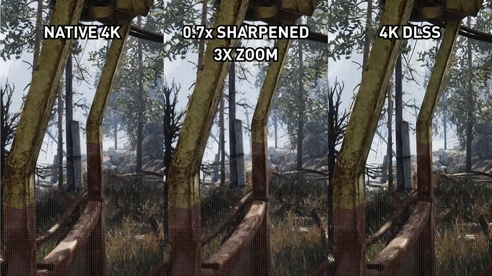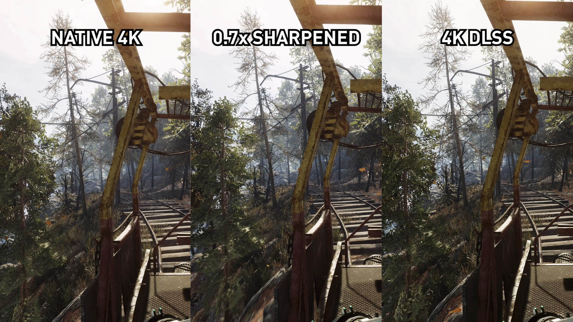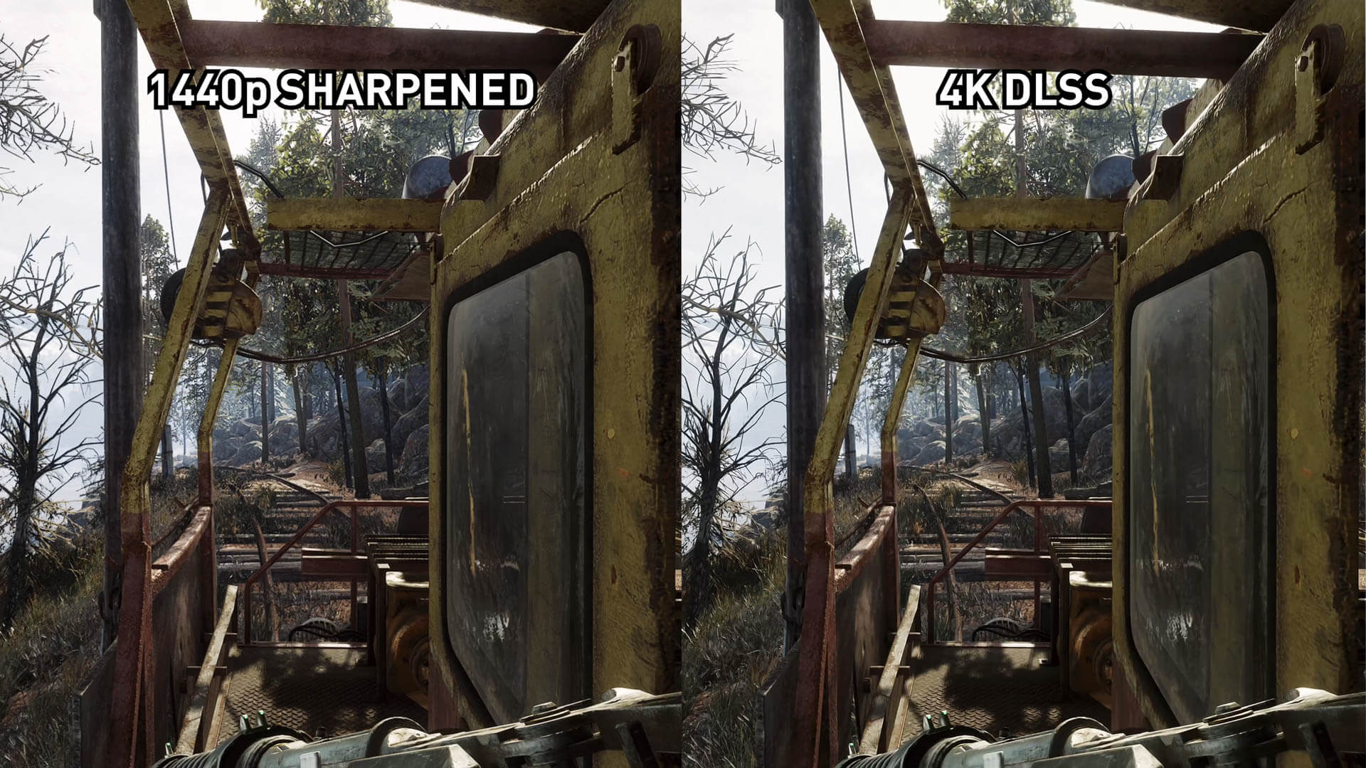 Dans le meilleur des cas, DLSS est presque aussi précis que 1800p pour les gros éléments et les textures proches. Mais DLSS souffre toujours de l’effet de «peinture à l’huile» mentionné dans notre enquête initiale, qui a l’air médiocre dans certains environnements et qui souffre d’une perte de détail, en particulier pour les roches et le feuillage. La façon dont il "épaissit" des détails très fins tels que des branches d’arbres ou des fils dégrade également l’image DLSS à notre avis. Globalement, le 1800p affûté se rapproche beaucoup plus du 4K natif que du DLSS, du moins en métro.