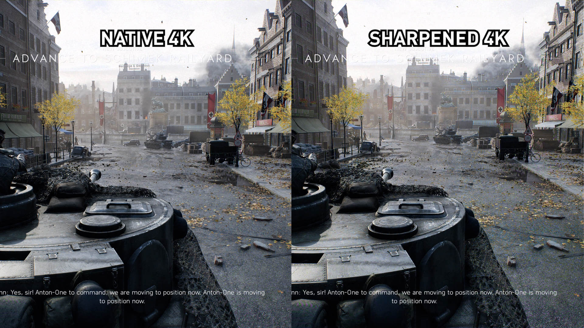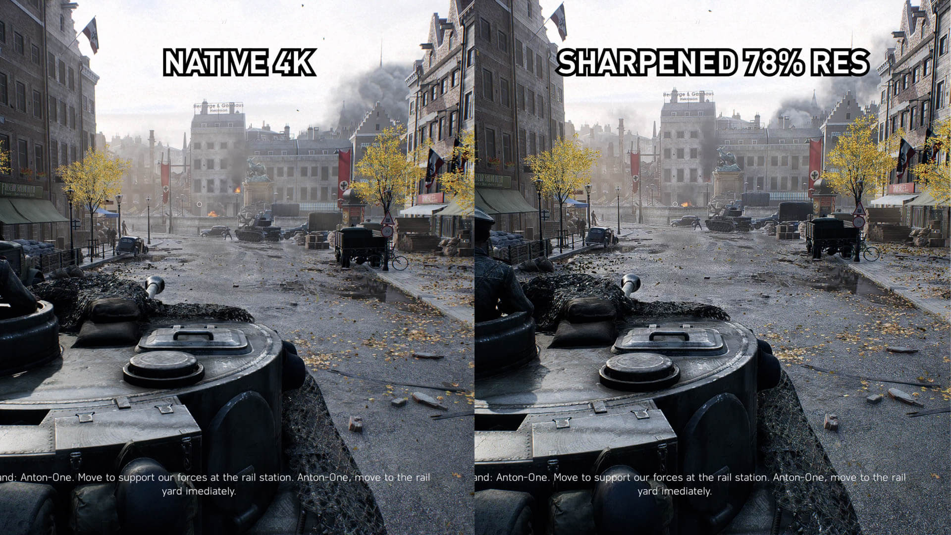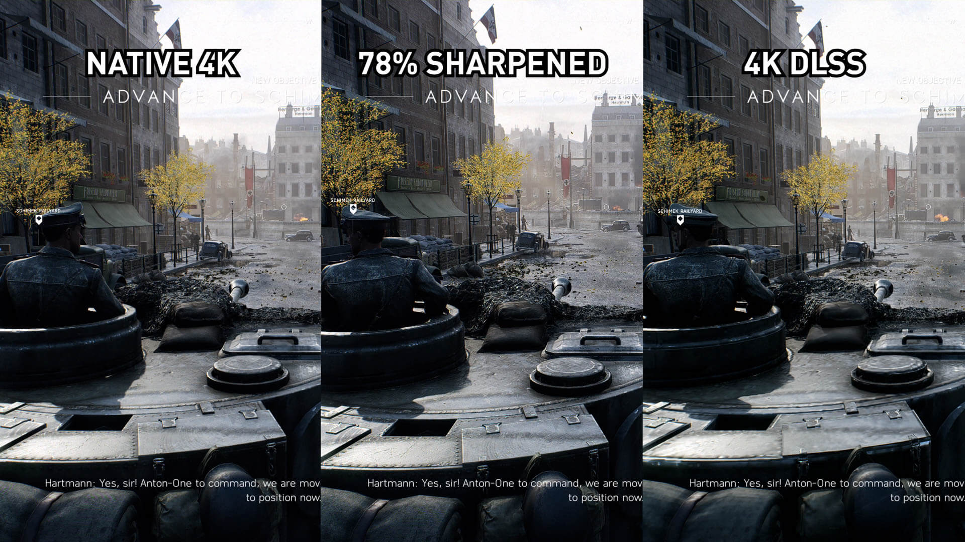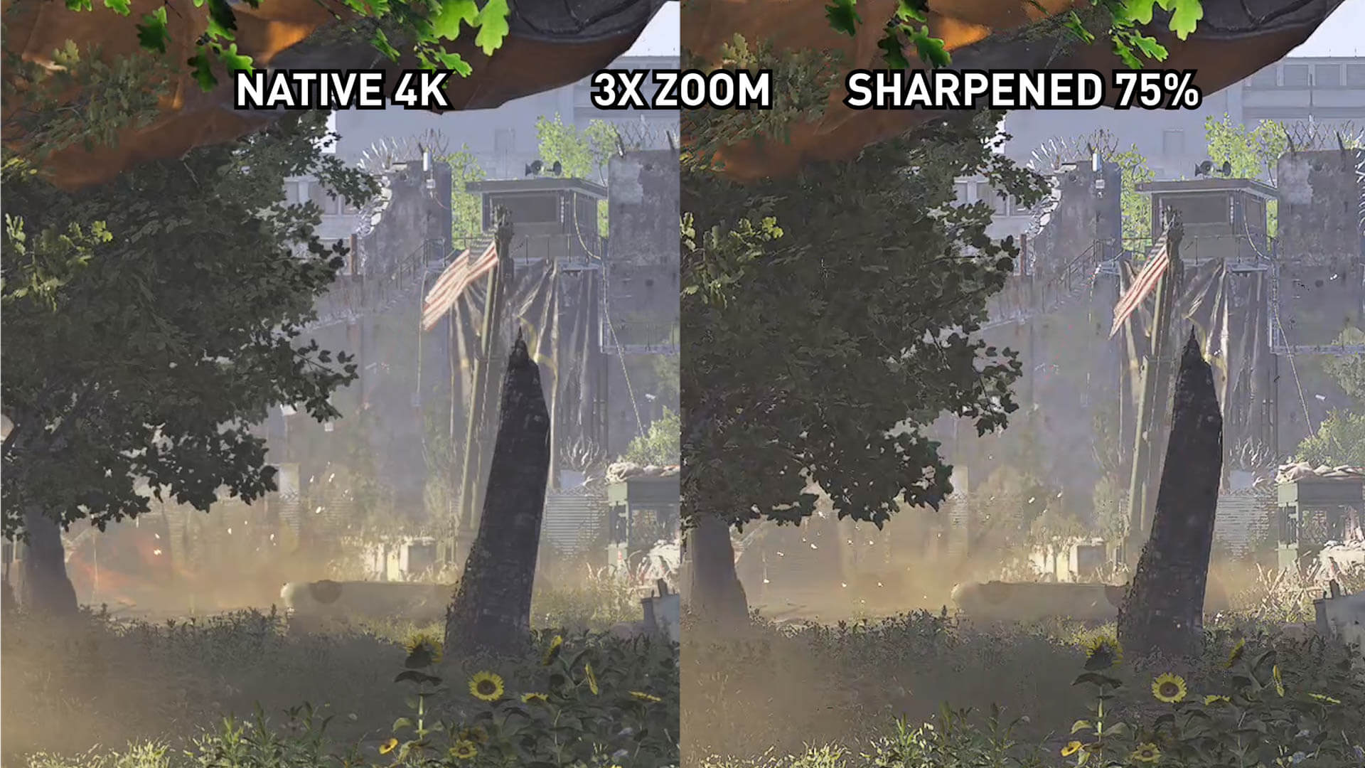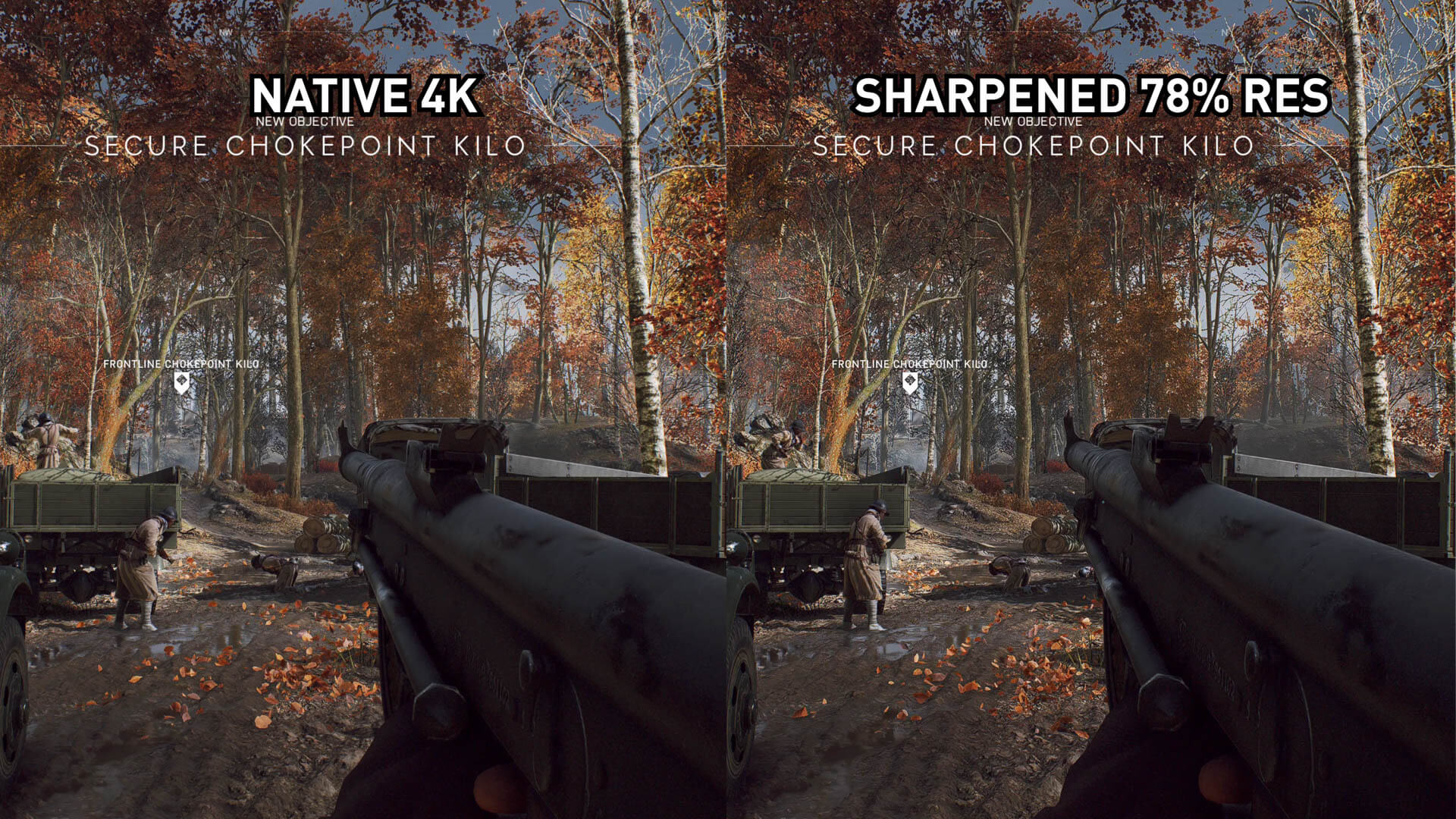 L’affûtage n’est pas aussi efficace avec cette scène au feuillage dense de Battlefield V, mais c’est un travail décent de se rapprocher suffisamment de l’image 4K native. Bien entendu, cette perte de qualité visuelle minime se traduit par une amélioration des performances allant jusqu'à 30%.