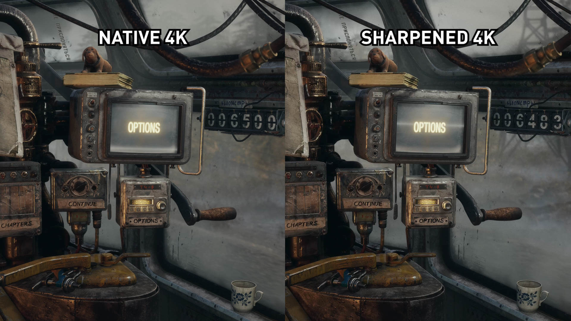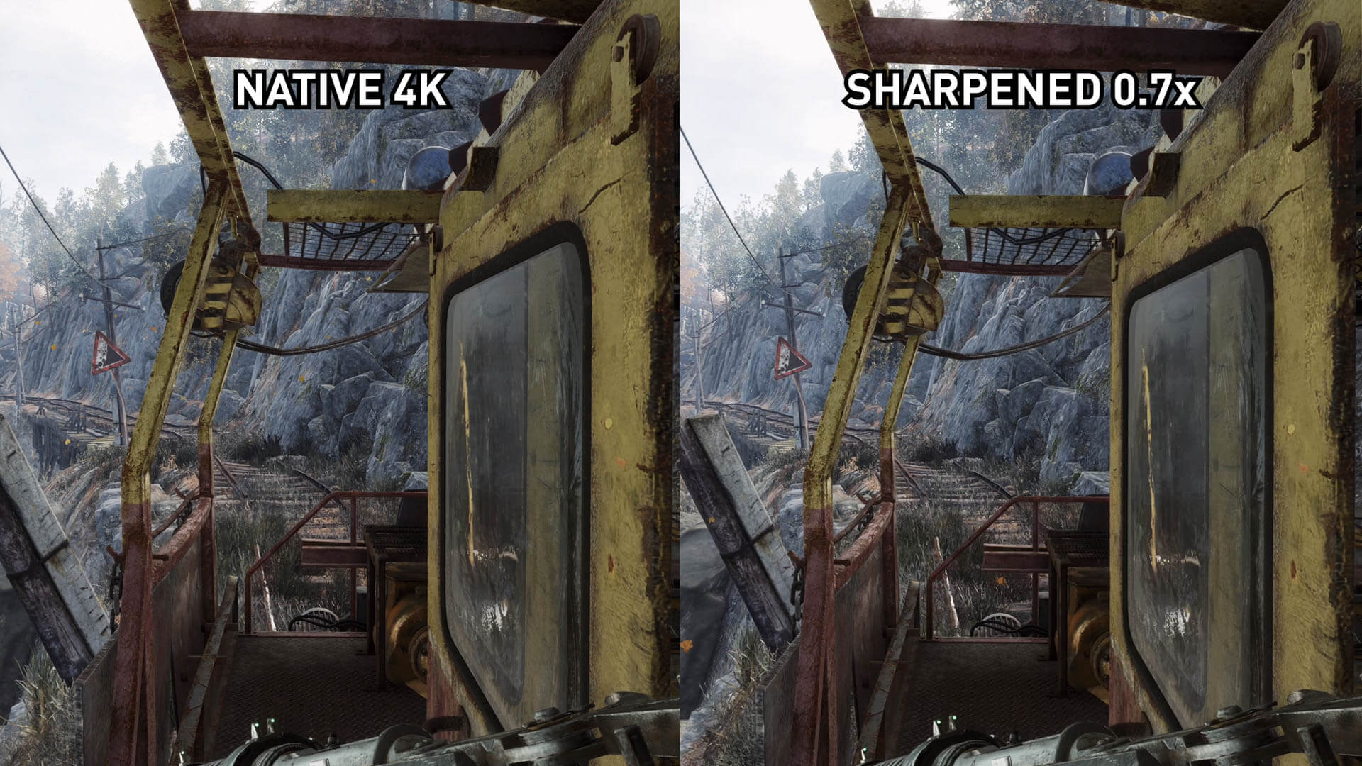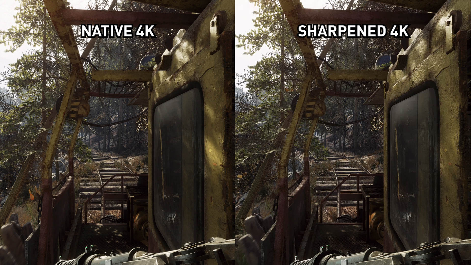 Commençons par comparer la différence entre RIS activé et désactivé à 4K natif. Metro n’est pas le jeu le plus sophistiqué aux résolutions natives, c’est un peu mou et il n’ya pas d’anti-aliasing dans le jeu, mais la présentation 4K native contient encore beaucoup de détails.
