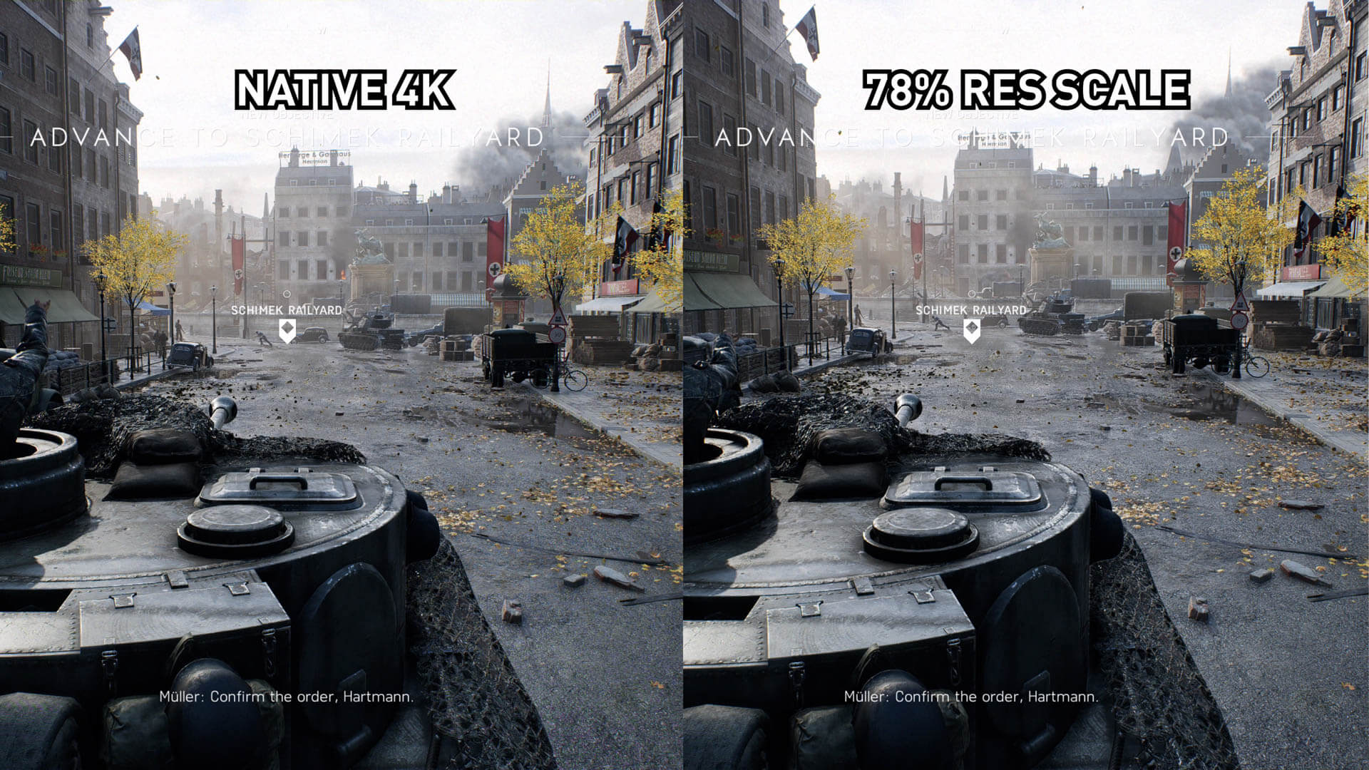 Pour le sous-échantillonnage de la résolution, nous nous sommes concentrés sur une résolution de 78%, ce qui correspond à environ 1700p, car elle correspond à l’augmentation des performances de DLSS dans ce titre. Battlefield V gère très bien la montée en gamme et ne semble en réalité que légèrement pire à une échelle de 78% par rapport au 4K natif dans cette scène; c’est un peu plus doux, un peu moins détaillé mais dans l’ensemble, pas mal. Cela en fait un candidat idéal pour la netteté. En effet, avec RIS, l’image est en fait plus nette que la 4K native bien qu’elle provienne d’une résolution inférieure. Impressionnant.