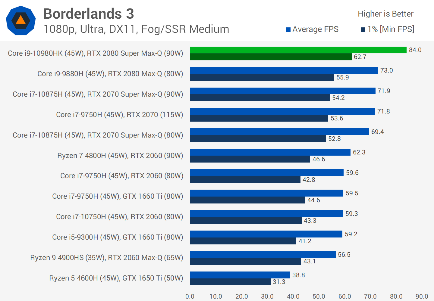 Borderlands 3 est un autre bon résultat pour le 2080 Super Max-Q. Ce titre est entièrement limité par le GPU sur les ordinateurs portables de jeu avec des paramètres Ultra, et comme avec Red Dead, nous voyons une avance de 17% sur le 2070 Super Max-Q, ainsi que 17% sur le RTX 2070. Des gains sur le 2080 Max-Q sont plus modestes, mais c'est encore suffisant pour produire les résultats les plus rapides que nous ayons vus jusqu'à présent.