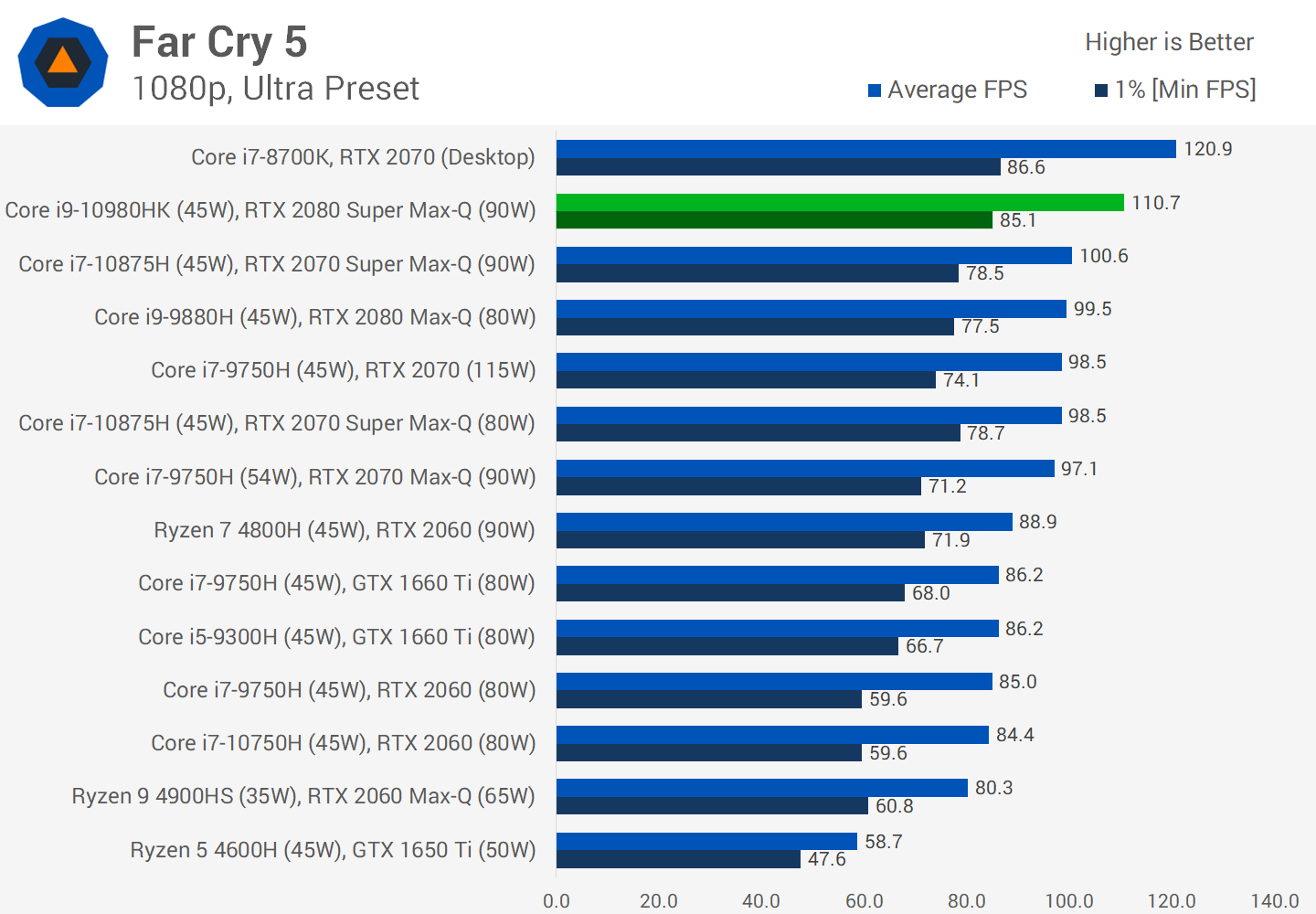 Far Cry 5 bénéficie également de la puissance du processeur, mais il utilise principalement un petit nombre de threads, et sans beaucoup de performances monocœur supplémentaires proposées entre les processeurs ici, la différence revient à nouveau au GPU. Le RTX 2080 Super Max-Q a 10% d'avance sur le 2070 Super Max-Q et jusqu'à 15% devant le RTX 2070.