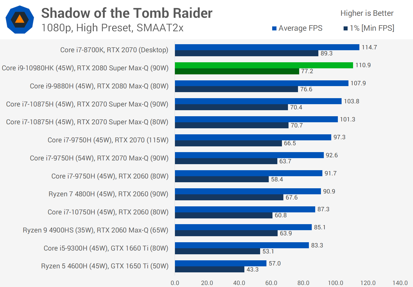Shadow of the Tomb Raider est un autre jeu très exigeant pour les ordinateurs portables. La performance du RTX 2080 Super Max-Q par rapport au 2070 Super Max-Q est plus modeste que dans les autres titres, à seulement 7% pour les fréquences d'images moyennes et 10% pour les bas de 1%. Il commande cependant une avance plus importante par rapport à 2070, à environ 15% malgré sa consommation d'énergie inférieure.