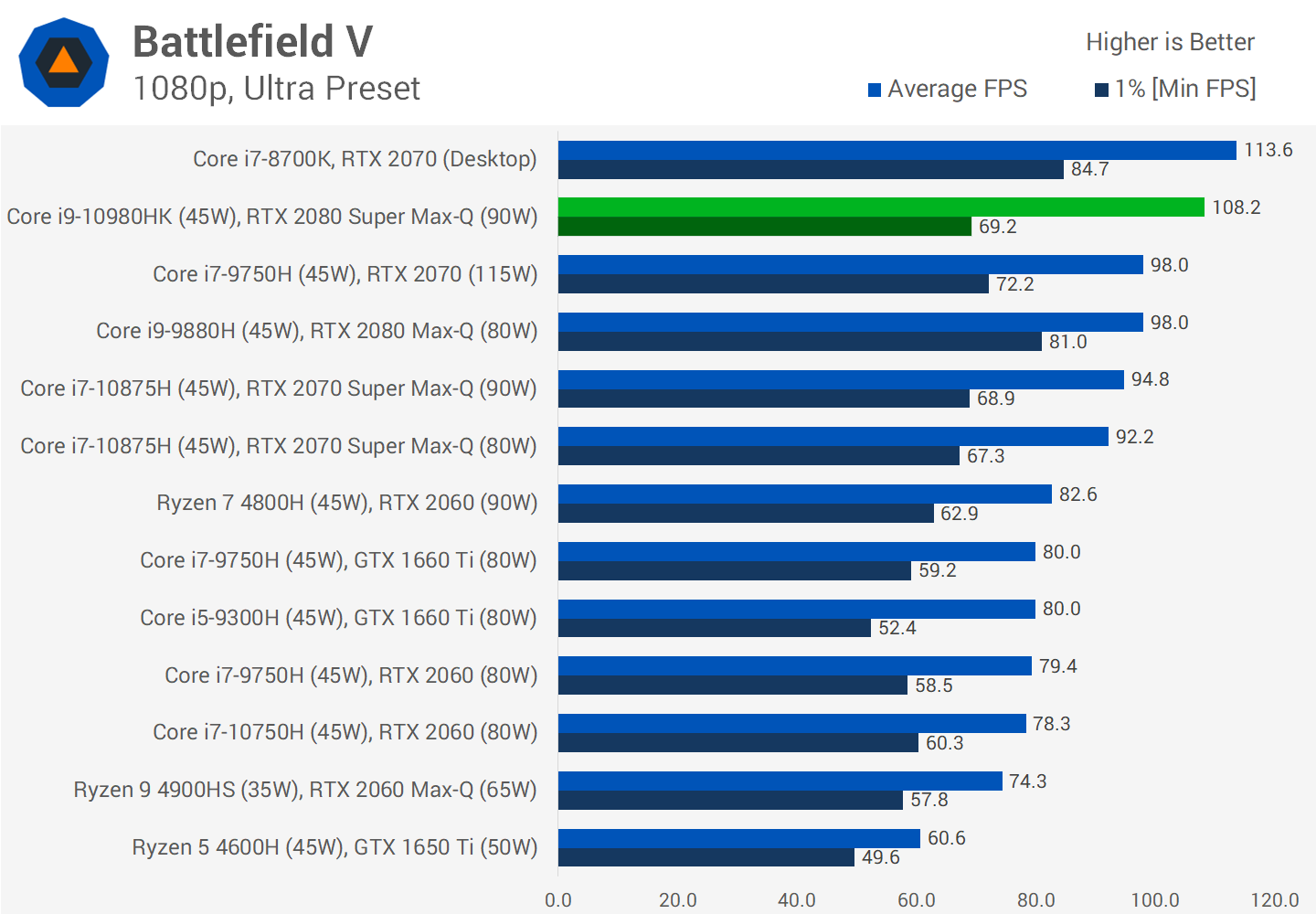 Battlefield V est un autre titre où le 2080 Super Max-Q détient une avance de performance de l'ordre de 15% par rapport au RTX 2070 Super Max-Q, du moins en ce qui concerne les fréquences d'images moyennes.