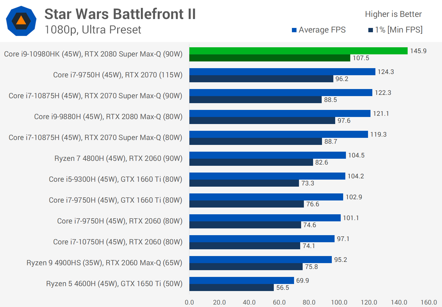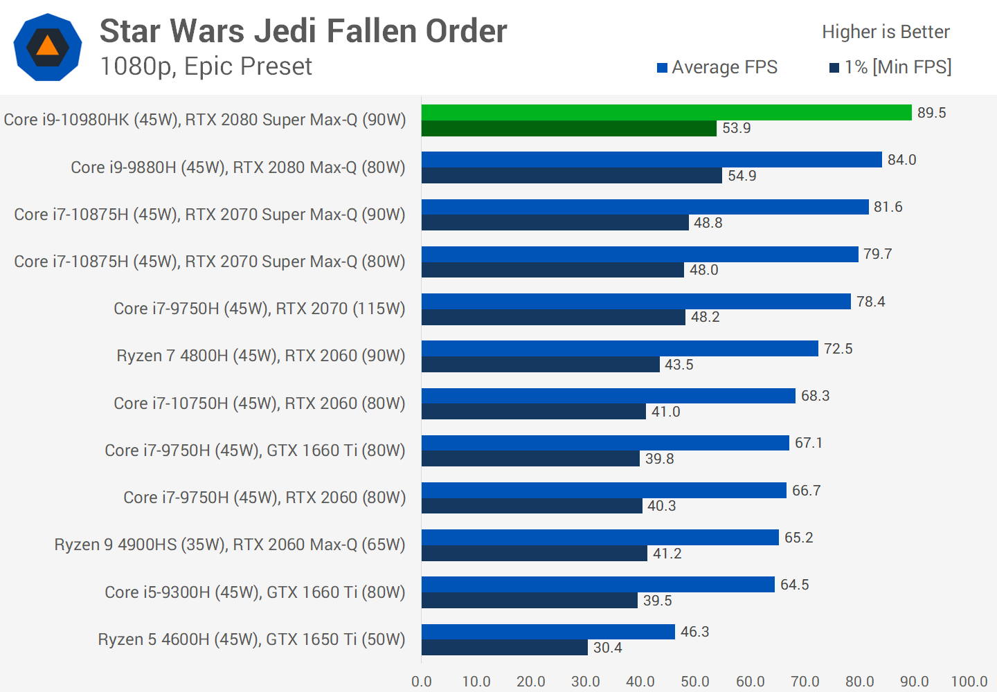 Star Wars Jedi Fallen Order est principalement limité par le GPU dans notre passe de référence sur les ordinateurs portables, bien que certaines sections touchent plus le processeur. Heureusement, tous nos ordinateurs portables RTX 2080 Super, RTX 2070 Super et RTX 2080 que nous avons testés jusqu'à présent utilisent des processeurs 8 cœurs similaires à 45 W, ce qui n'entraîne que des différences CPU mineures.