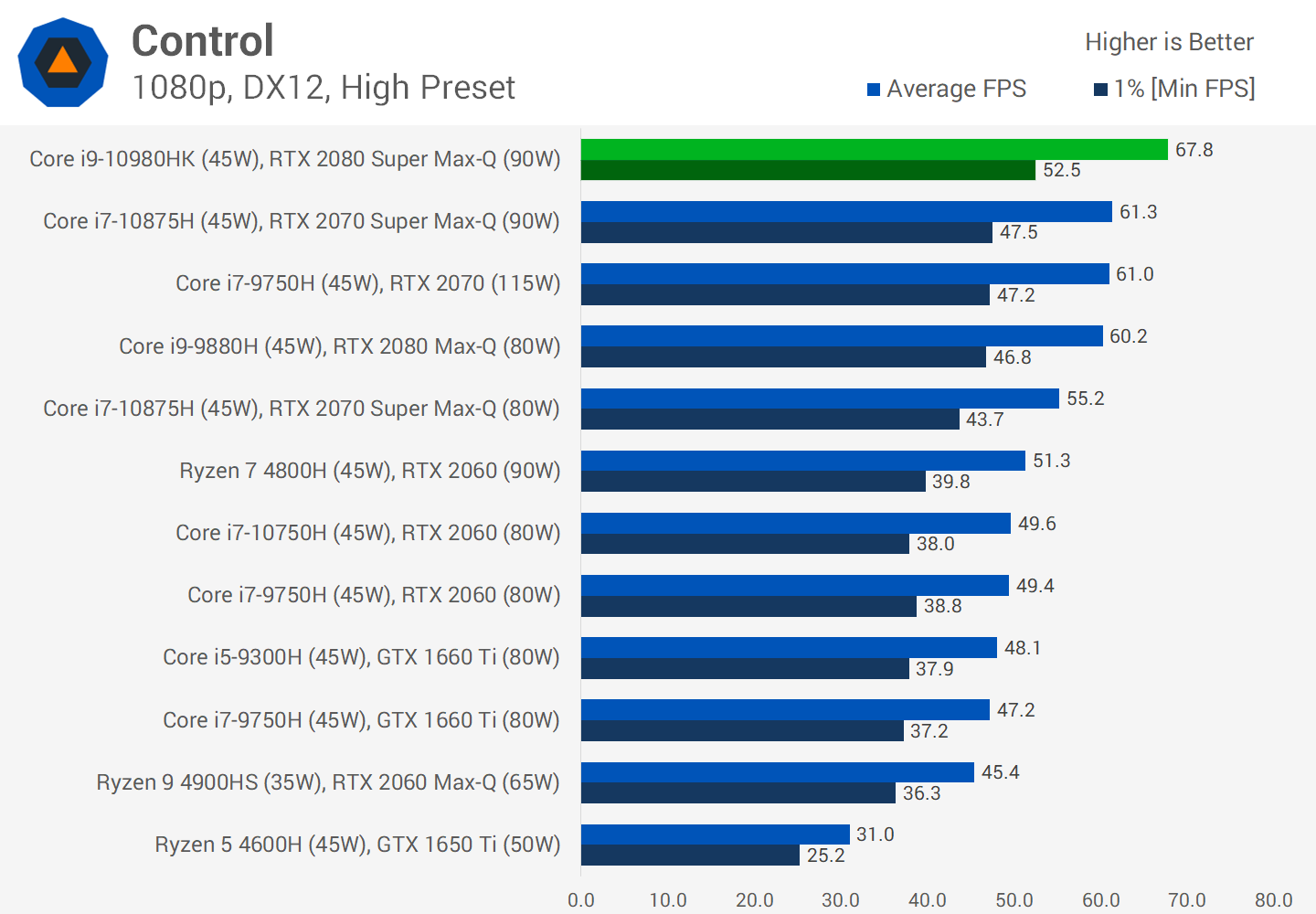 Control est un titre très exigeant en GPU, l'un des plus exigeants de notre suite de tests fonctionnant avec le préréglage High, le maximum du jeu. Comme Fallen Order auparavant, le 2080 Super Max-Q sort environ 11% de la tête du 2070 Super Max-Q lorsque les deux GPU fonctionnent à 90 W.