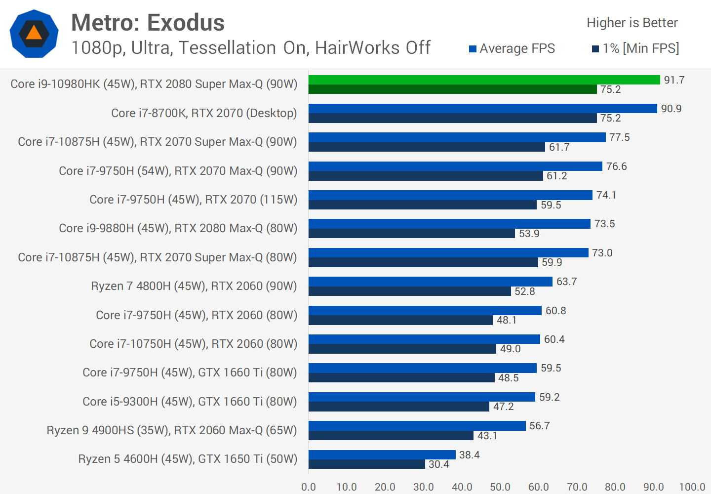 Dans Metro Exodus, nous voyons le RTX 2080 Super Max-Q à 90 W offrir les performances d'un ordinateur de bureau RTX 2070, ce qui est une excellente comparaison si vous voulez savoir comment ces types d'ordinateurs portables se comportent lorsqu'ils sont confrontés à leurs homologues de bureau. En termes de comparaison d'ordinateurs portables, le 2080 Super Max-Q est 18% plus rapide que le 2070 Super Max-Q et 24% d'avance sur le RTX 2070.