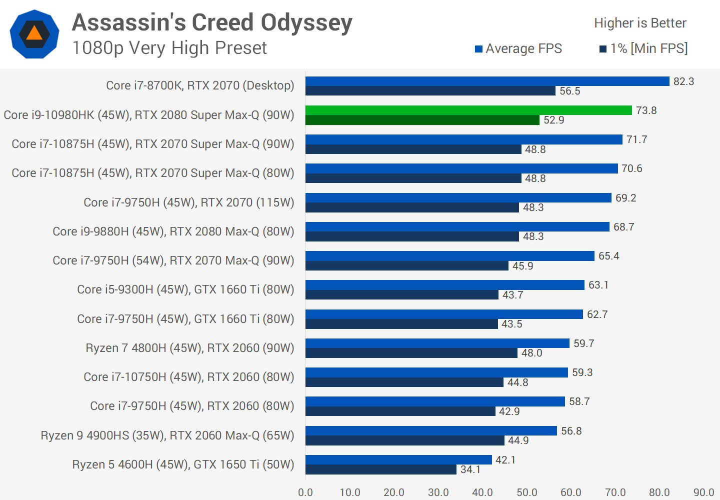 Tous les jeux ne bénéficieront pas de la puissance GPU accrue dont vous disposez. Un tel exemple est Assassin’s Creed Odyssey, qui frappe durement le CPU et le GPU sur les ordinateurs portables.