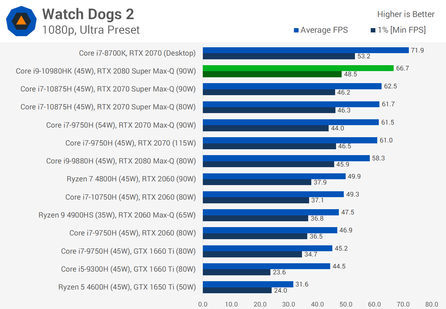 Watch Dogs 2, comme Assassin’s Creed Odyssey, est un jeu qui nécessite à la fois une puissance CPU et GPU. Il y a toujours une avance de performance pour le RTX 2080 Super Max-Q, mais ce n'est pas aussi important que dans les titres plus limités par le GPU.