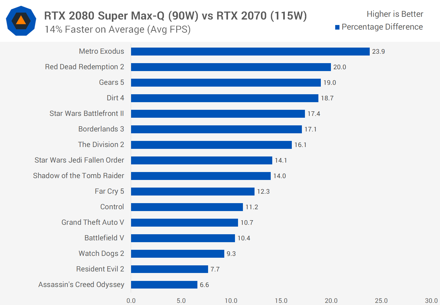 Avec une avance de performances de 14% en moyenne, nous ne parlons pas d'une différence incroyable, mais étant donné que ce GPU peut être utilisé dans des systèmes minces et légers alors que le RTX 2070 à 115 W ne le peut généralement pas, ces gains d'efficacité sont importants.
