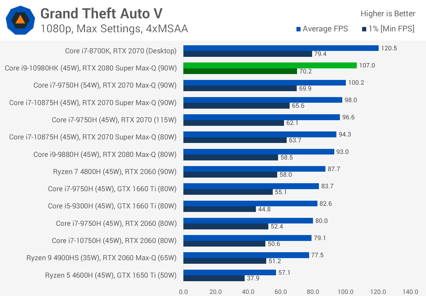 Et enfin, nous avons Grand Theft Auto V, qui est un autre titre qui fournit une avance de performances de ~ 10% pour le 2080 Super Max-Q par rapport au 2070 Super Max-Q et au RTX 2070 régulier. Rien de particulièrement étonnant à noter ici.