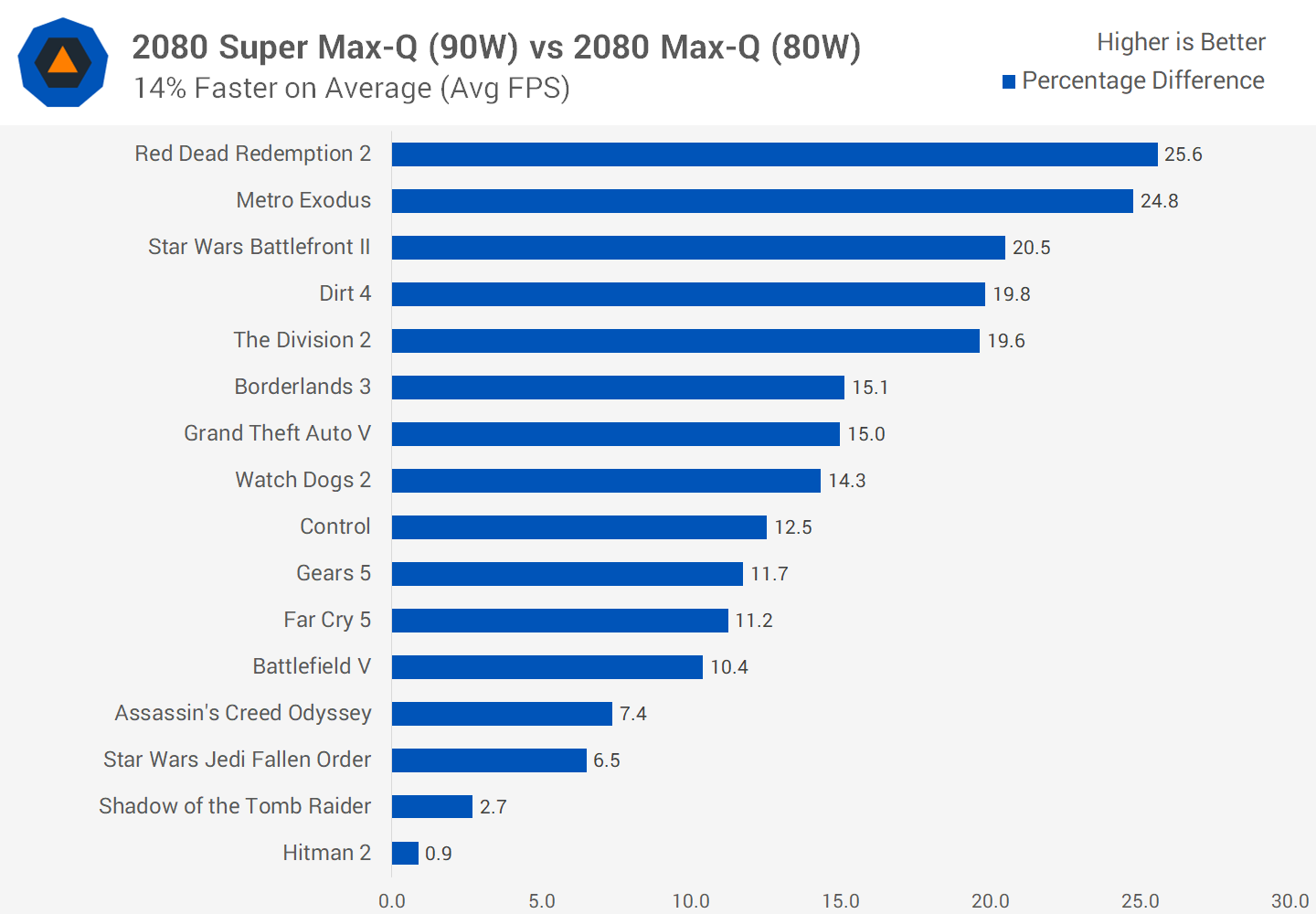 Enfin, nous avons une comparaison entre le RTX 2080 Super Max-Q fonctionnant à 90W et le RTX 2080 Max-Q fonctionnant à 80W. Avec une puissance supplémentaire de 10 W et une efficacité accrue, la variante Super se termine 14% plus rapidement. Sur la base de ces chiffres, nous nous attendons à des gains élevés à un chiffre lorsque les deux GPU fonctionnent à 90 W, ce qui rend le modèle Super plus rapide que ce qui précède, bien qu'il s'agisse toujours d'une mise à niveau incrémentielle.