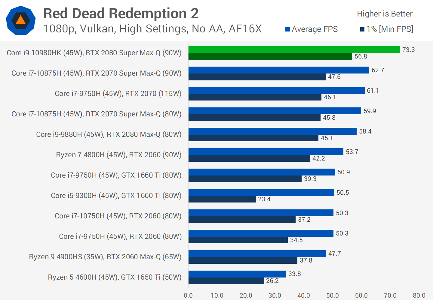 Commençons par Red Dead Redemption 2, l'un des titres les plus graphiques de notre suite de référence. Utilisant des paramètres élevés de 1080p, le 2080 Super Max-Q est le GPU le plus rapide que nous ayons rencontré jusqu'à présent, bien qu'il convient de noter que nous n'avons pas encore testé les versions Max-P des nouvelles variantes du Super GPU.