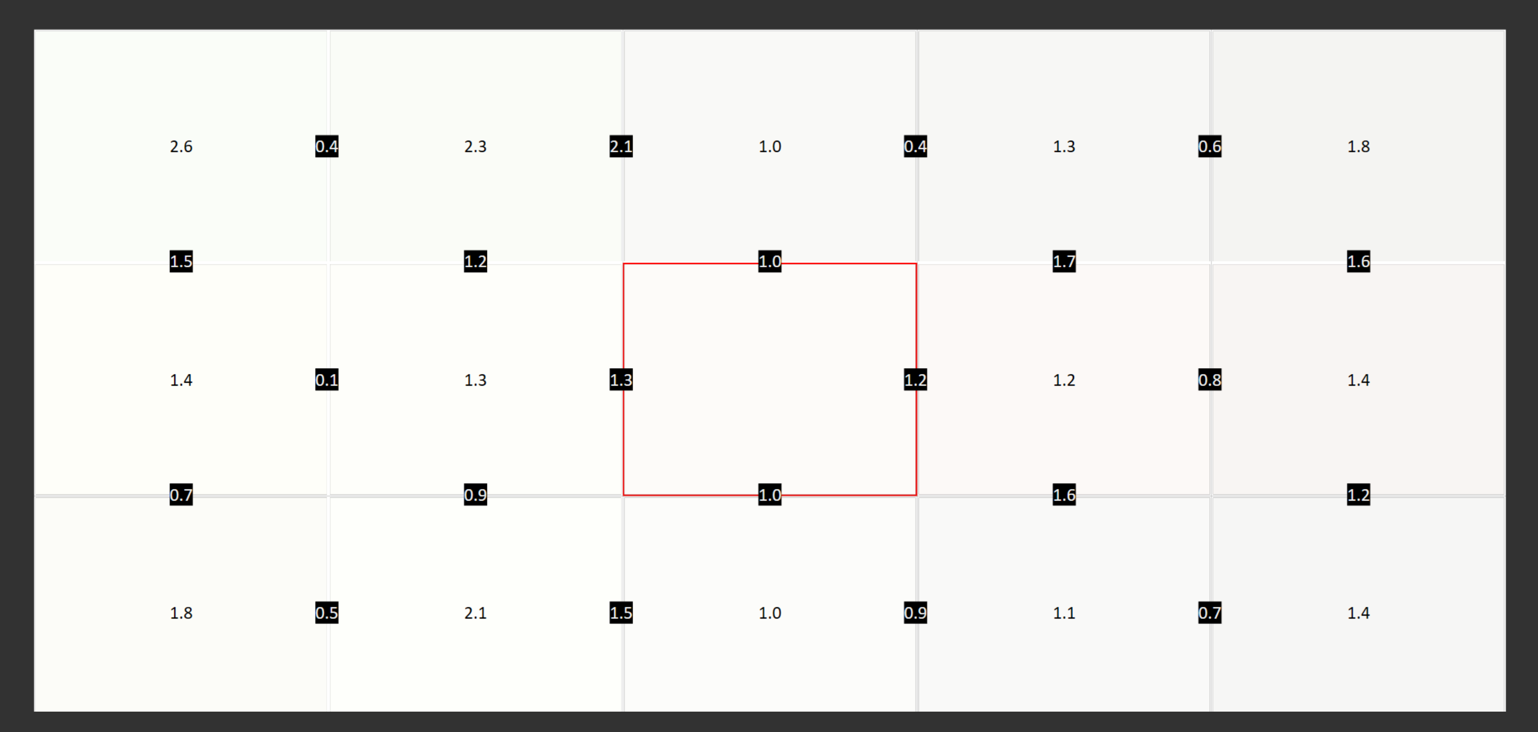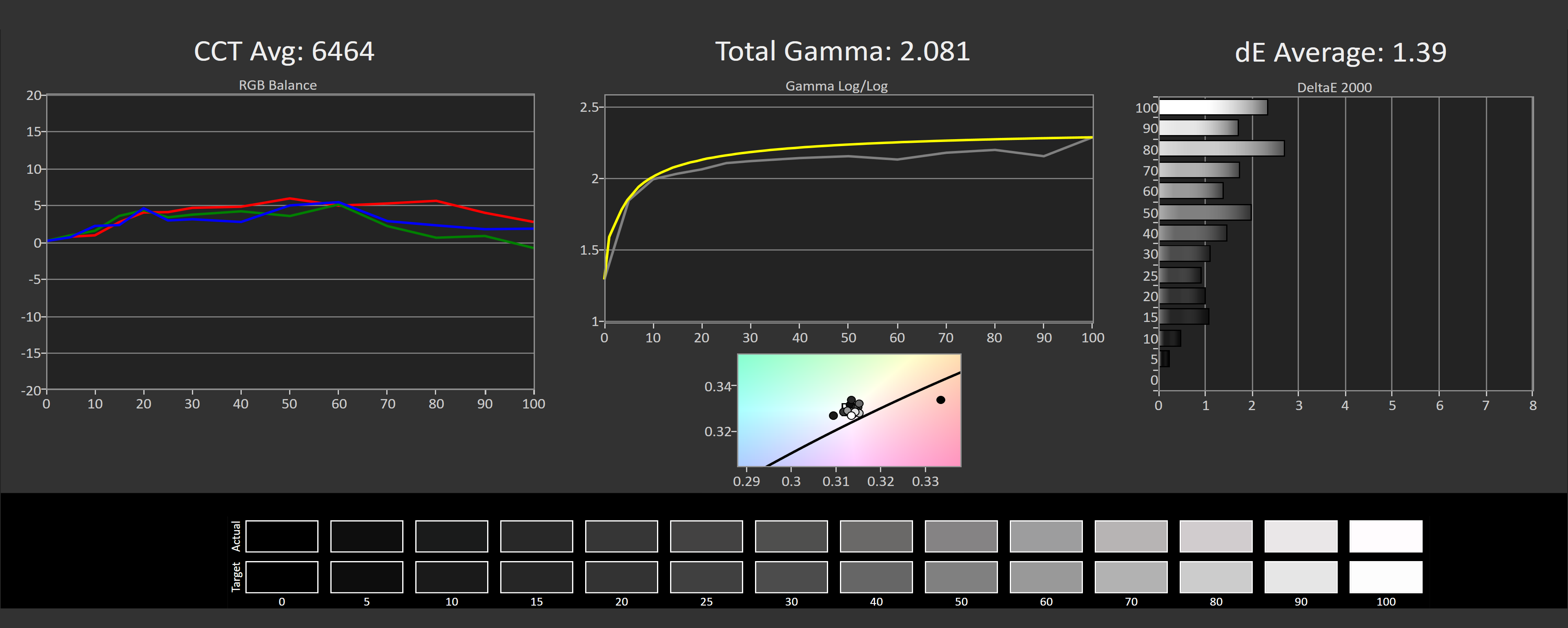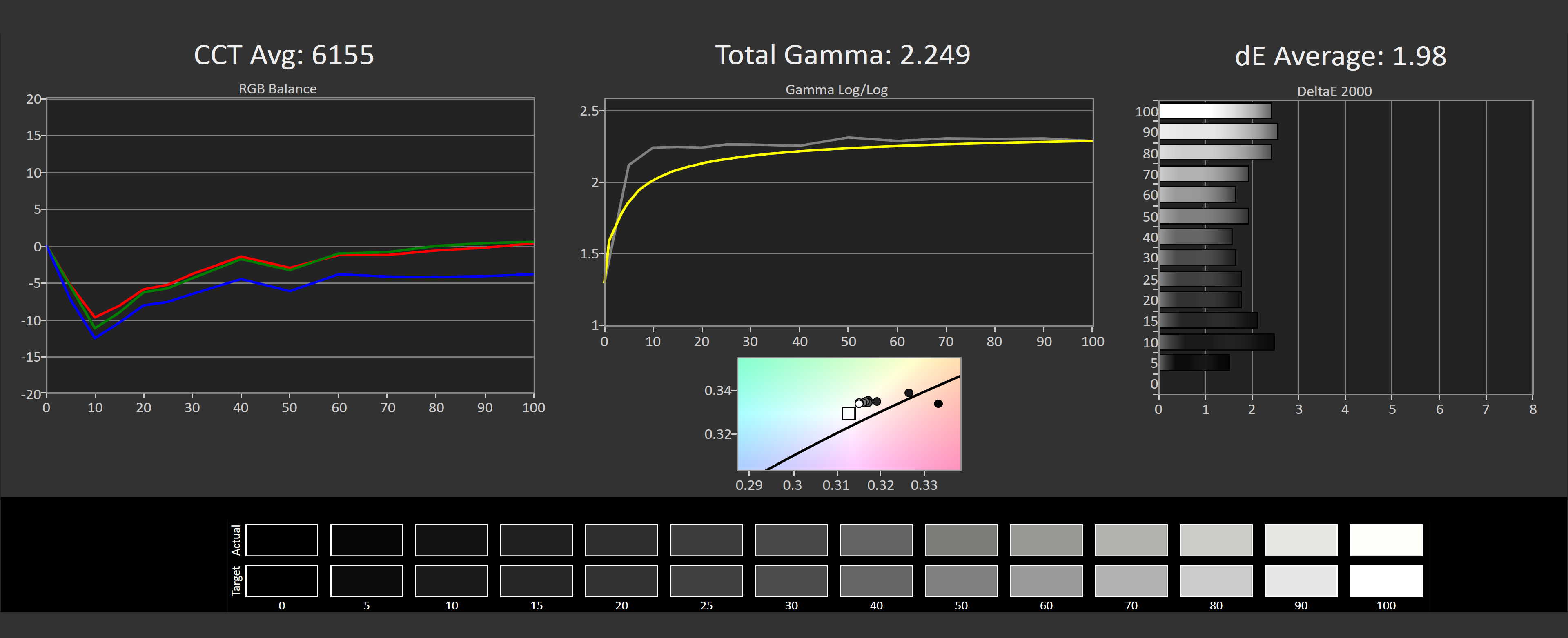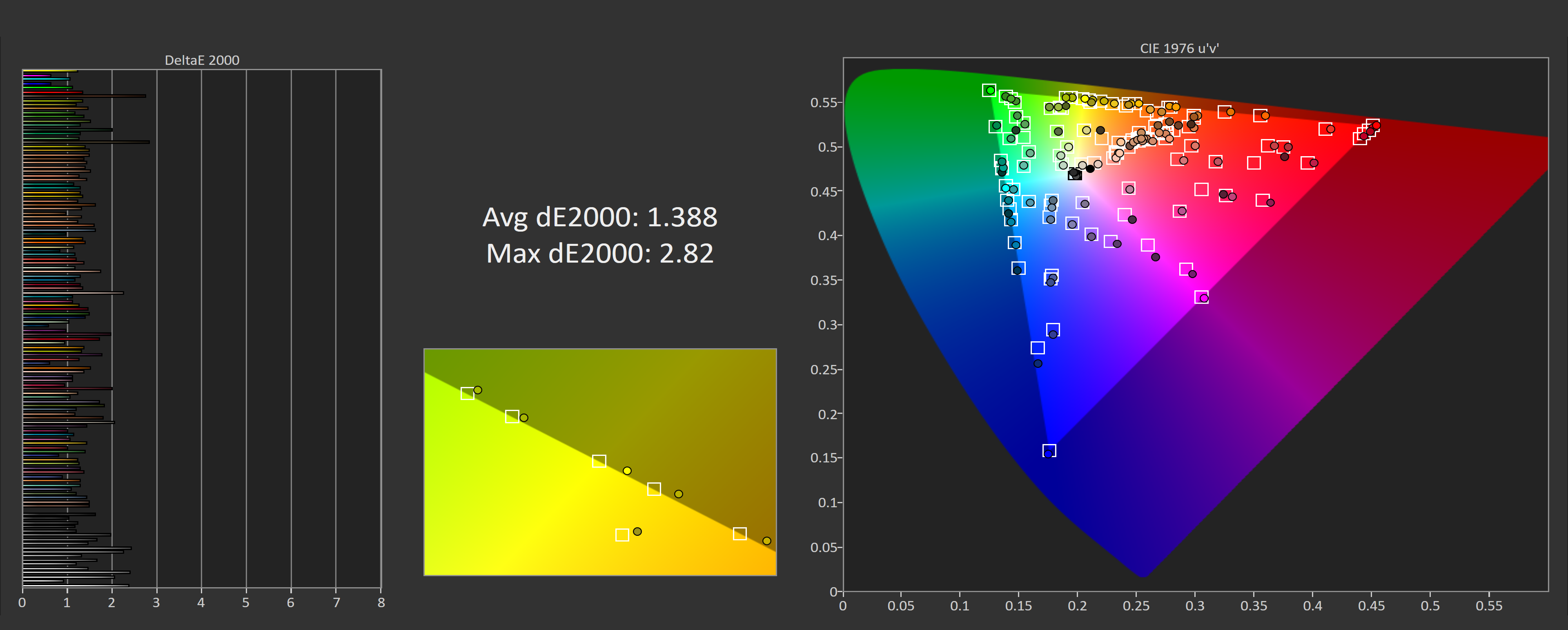 L'uniformité est très bonne aussi. Chaque pixel émettant de la lumière, il est difficile de tout uniformiser, mais Samsung a fait un travail remarquable ici. La quasi-totalité de l’écran se situe sous un deltaE de 2,0 par rapport au centre, c’est seulement le coin en haut à gauche de notre unité qui a légèrement dévié, ce qui n’a pas été observé dans la plupart des circonstances lors d’une utilisation normale.