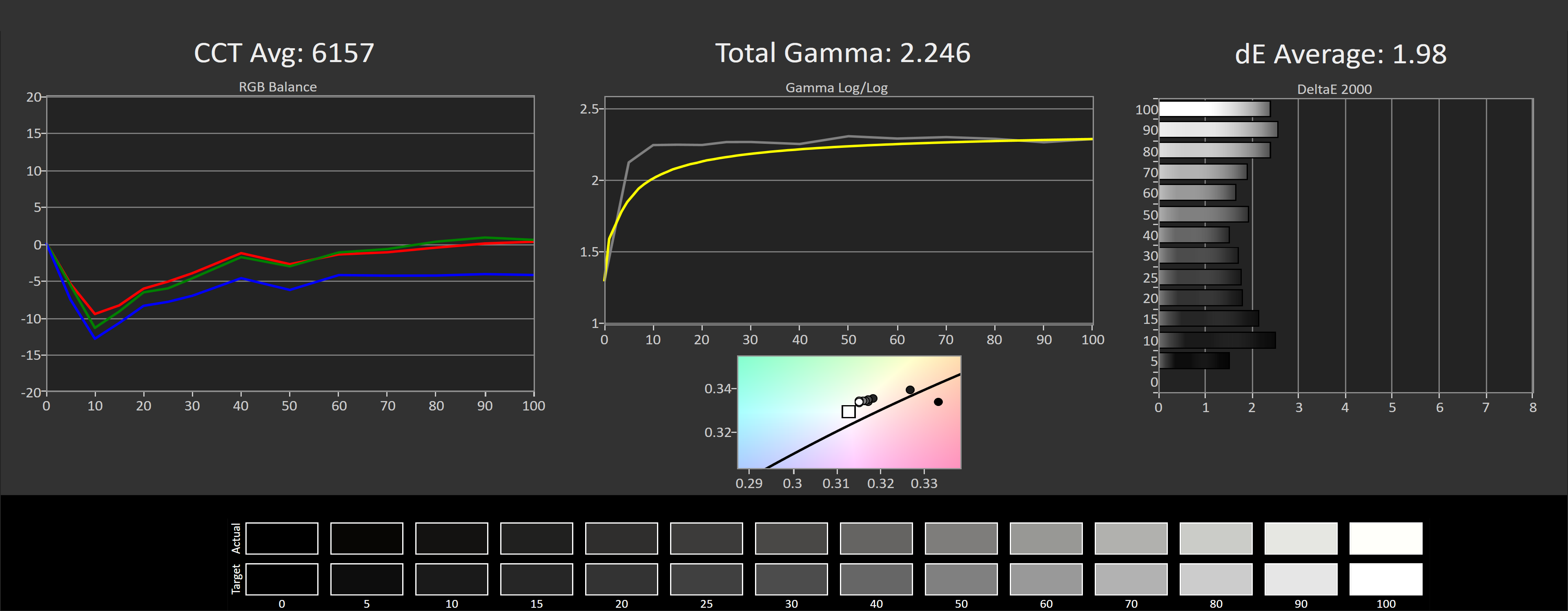 Lorsqu’on mesure l’OLED de l’Aero 15 contre sRGB, les performances hors du commun sont impressionnantes. Le seul petit inconvénient que nous avons, c’est que la moyenne CCT en niveaux de gris de 6157 est un peu chaude pour un usage général, et que la courbe gamma est légèrement trop élevée au bas de gamme, mais une moyenne deltaE de 1,98 est meilleure que celle de votre ordinateur portable typique. quelques légères modifications apportées à CCT seront parfaites pour la création de contenu.