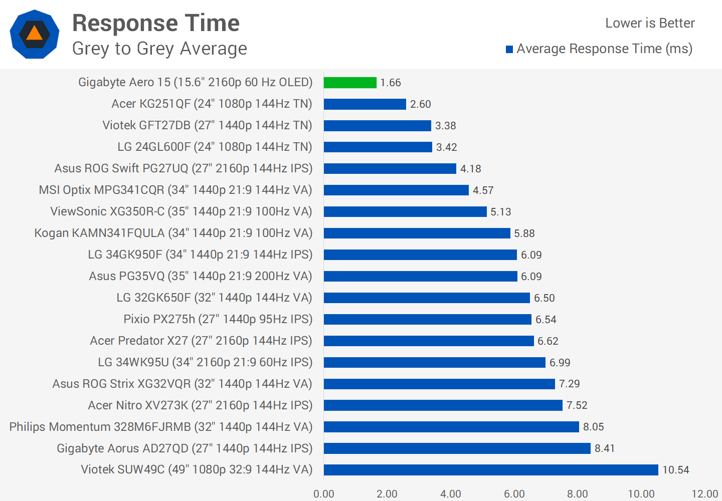 Les temps de réponse ne sont pas un gros problème pour la création de contenu, mais les joueurs seront enthousiasmés: j’ai mesuré des temps cohérents entre 1,6 et 1,7 ms, ce qui, honnêtement, est un peu lent comparé aux meilleurs téléviseurs OLED de LG qui peuvent effectuer une transition plus rapidement que 1,0 ms. Mais cela fait tomber n'importe quel écran LCD de l'eau. Même les écrans LCD cotés «1 ms» sont souvent plus proches de 3 ms, c’est donc un autre domaine où l’OLED domine l’écran LCD.