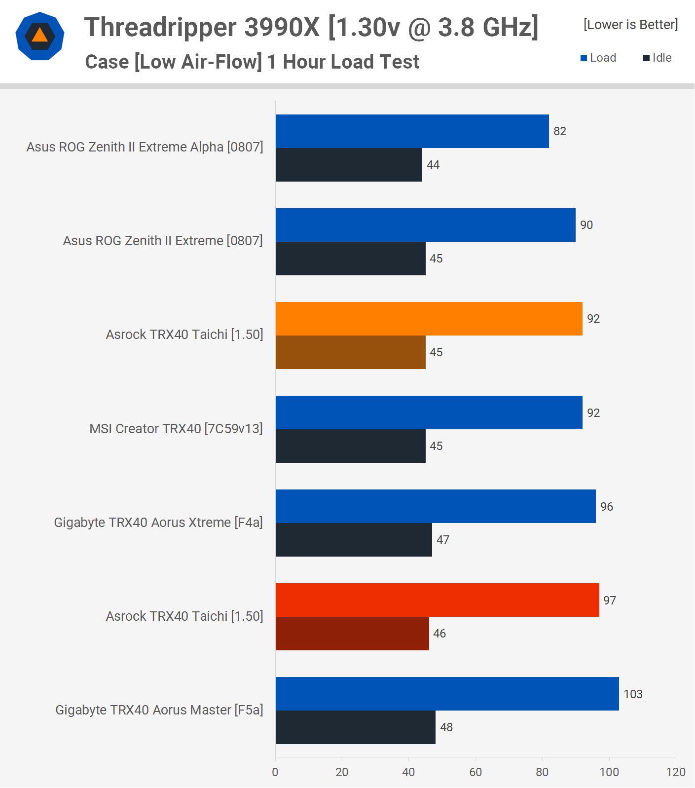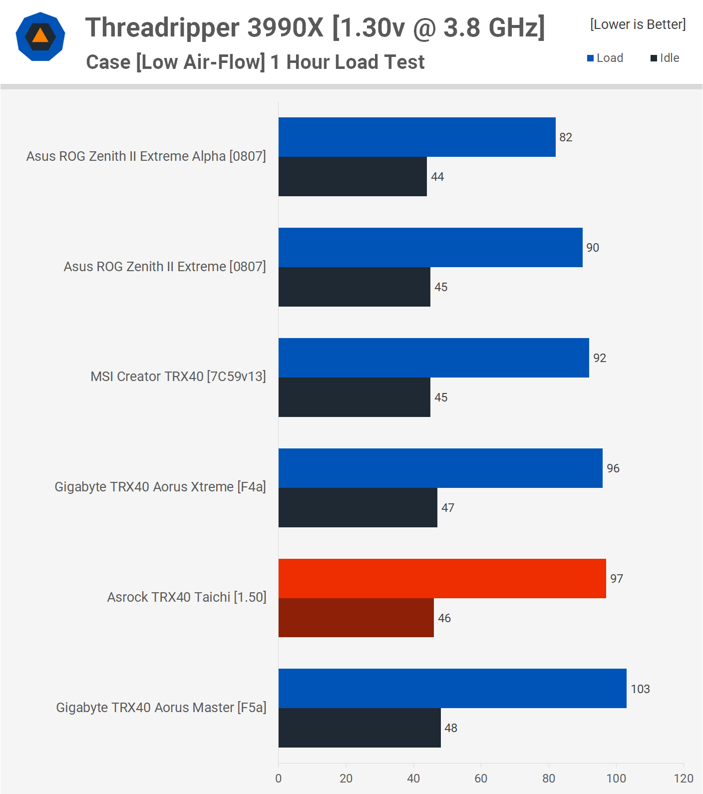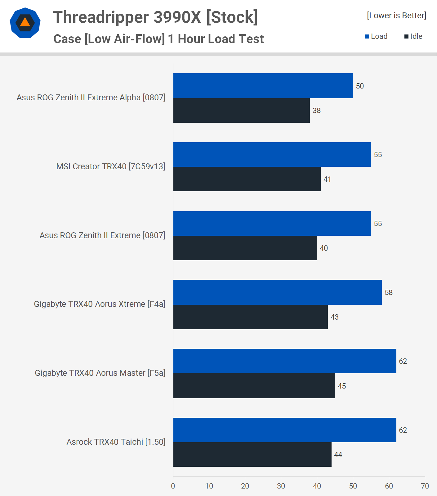 Pour appliquer une charge au système, nous utilisons une charge de travail réelle de Blender qui fonctionne pendant une heure, après quoi nous enregistrons la température de pointe du VRM. Le CPU de choix est naturellement le Threadripper 3990X et pour les tests, nous avons deux configurations: une configuration complètement stockée avec rien d'autre que XMP chargé, et une deuxième configuration OC qui voit le 3990X overclocké à 3,8 GHz en utilisant 1,3v. Nous aurions pu fonctionner à 4 GHz, mais nous ne pensions pas que beaucoup de choses changeraient, donc pour assurer la stabilité sur toutes les cartes, nous avons opté pour 3,8 GHz.