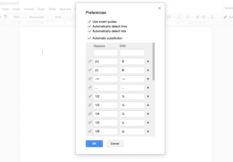 Pour Google Docs: Outils> Préférences. Ajouter loin. Assurez-vous que la case à côté de «Substitution automatique» est cochée.