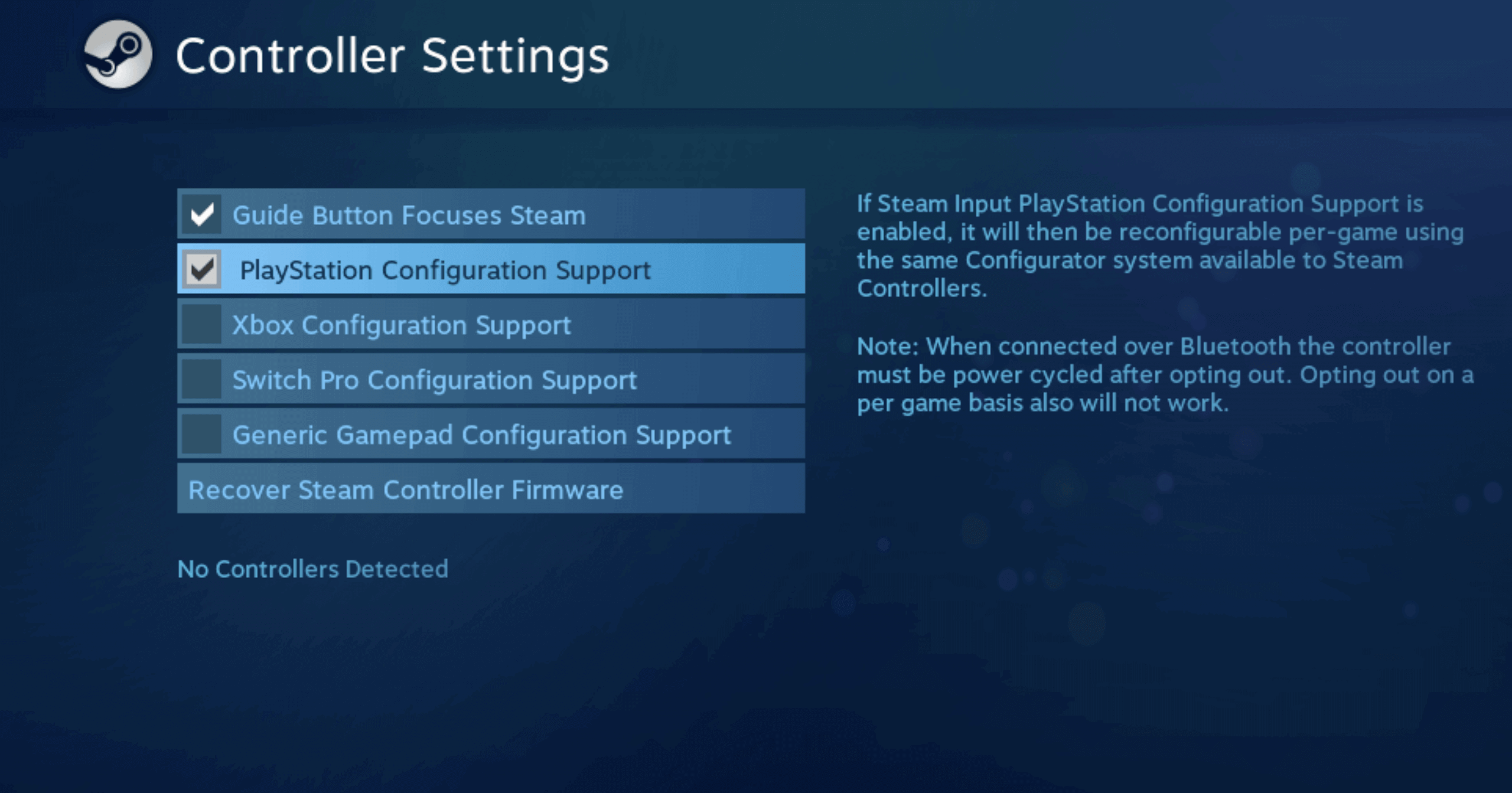 Nous avons également testé le DualShock 4 avec Steam sur PC, et il fonctionne très bien en mode "Grand écran" après un peu de bricolage. Après avoir démarré le lanceur Steam en mode Grand écran, vous souhaitez cliquer sur l’icône Paramètres (l’engrenage dans le coin supérieur droit). Cliquez sur l'onglet Paramètres du contrôleur et cochez la case "Assistance à la configuration PlayStation".