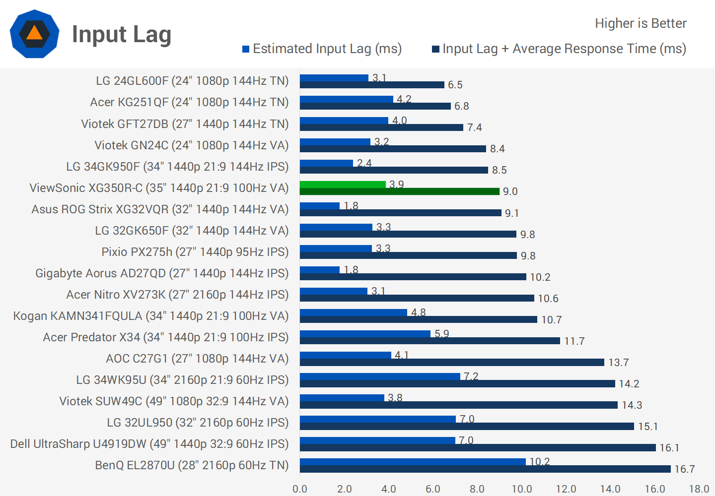 En termes de délai d'entrée, un autre résultat décent pour le XG350R-C avec une latence inférieure à 4 ms, ce qui correspond à la fourchette habituelle des moniteurs de jeu. Le LG 34GK950F est l’ultra ultra rapide le plus rapide que nous ayons testé à 2,4 ms de latence, mais nous parlons ici d’une différence mineure de 1 ms.