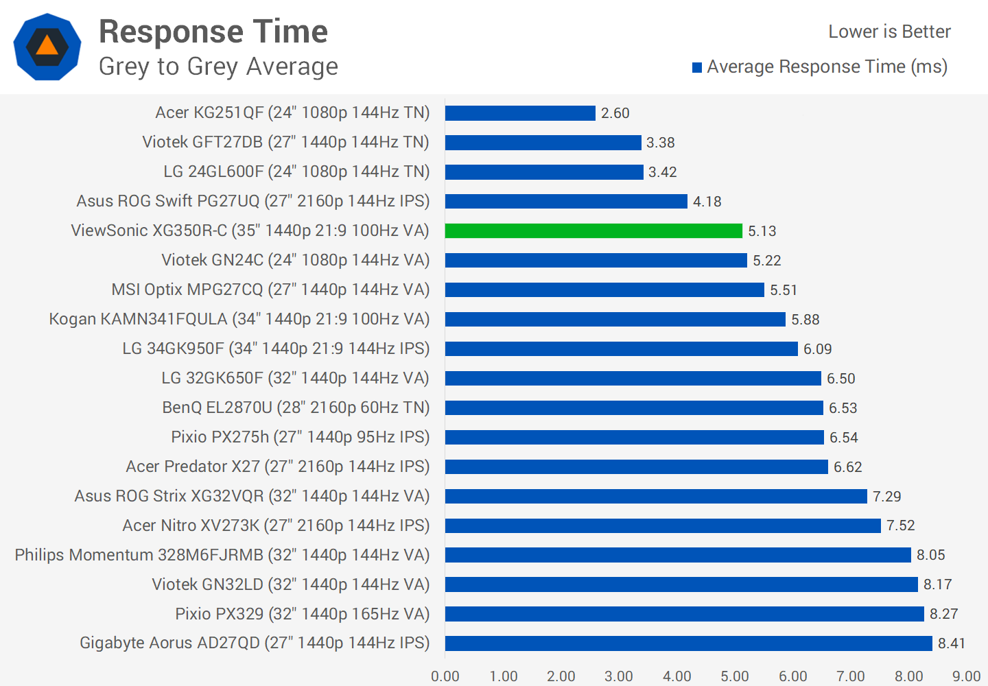 Le XG350R-C est environ 0,7 ms plus rapide que l’équivalent VA de 34 pouces de ce panneau que vous voyez dans les offres budgétaires telles que l’ultra large de 34 pouces de Kogan. La différence étant que les panneaux de 34 pouces sont fabriqués par Samsung, alors que les modèles de 35 pouces de AU Optronics. Cet écran ViewSonic est également un peu plus rapide que les meilleurs écrans LG IPS à offrir avec cette résolution, comme le montre le LG 34GK950F et son temps de transition de 6,1 ms. Néanmoins, il y a un peu une grappe dans cette tranche de 5-6ms avec pas beaucoup de différence entre chaque option.