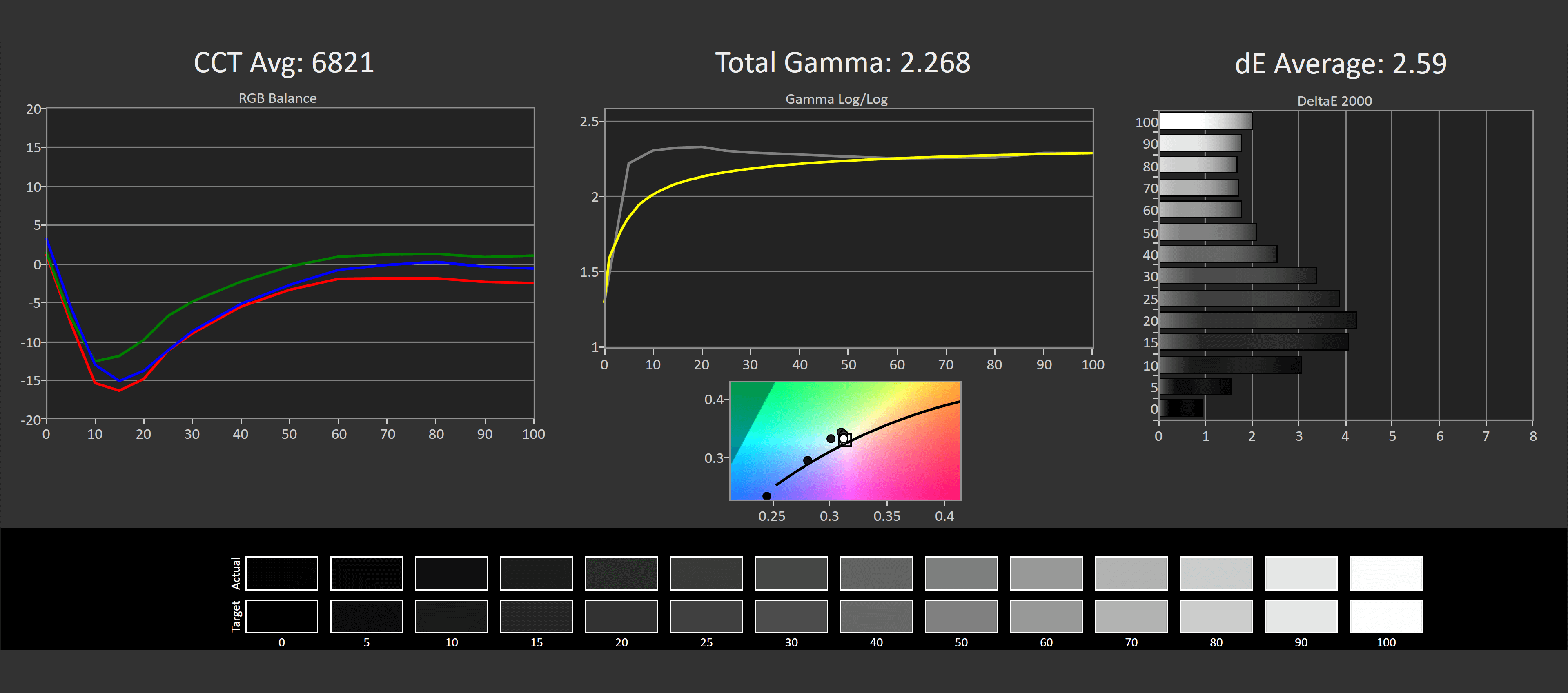 Étant donné que la plupart des moniteurs de jeu sont livrés avec très peu d'étalonnage, nous sommes heureux de voir les résultats presque précis du ViewSonic XG350R-C prêt à l'emploi. Avec quelques ajustements mineurs et des changements dans les commandes de couleur de l'affichage à l'écran, j'ai été en mesure de resserrer davantage les choses, avec des moyennes deltaE inférieures à 2,0 sur l'ensemble du tableau, ce qui est très frappant ici.