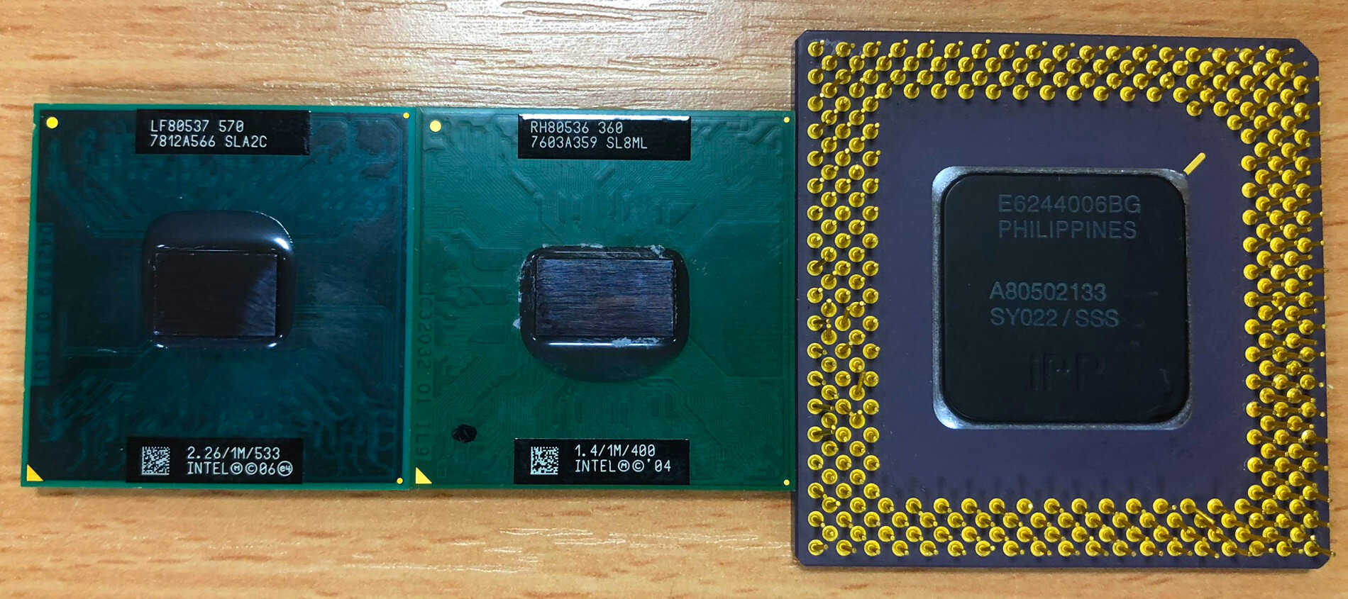 Dans l'image ci-dessus, nous examinons trois anciens processeurs Intel. En partant de la gauche, nous avons un Celeron 2006, un Pentium M 2004 et un très vieux Pentium de 1995. Ils ont respectivement un noeud de processus de 65, 90 et 350 nm. En d’autres termes, les éléments critiques du modèle de 24 ans sont plus de 5 fois plus grands que ceux de 13 ans. Une autre différence importante réside dans le fait que la puce la plus récente contient environ 290 millions de transistors, alors que celle du Pentium d'origine en contient tout juste plus de 3 millions. presque des centaines de fois moins.