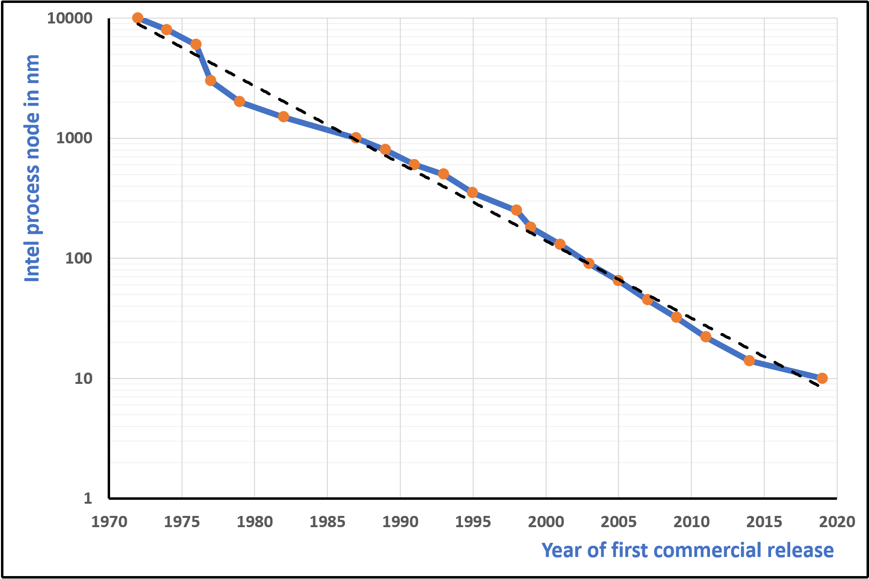L'image ci-dessus illustre les changements de nœud de processus d'Intel au cours des 50 dernières années. L'axe vertical indique la taille du noeud par facteur de 10, à partir de 10 000 nm. Le géant des puces a suivi une demi-vie approximative des noeuds (le temps nécessaire pour réduire la taille des noeuds de moitié à chaque fois) de 4,5 ans.